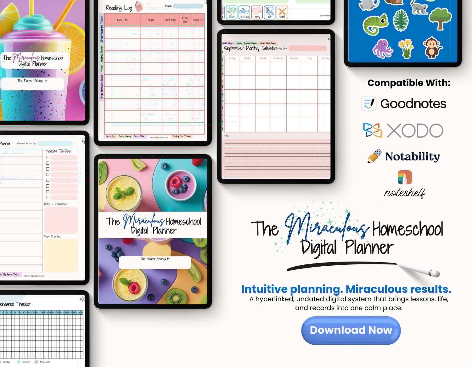 Turn busy school days into calm, organized progress. The Miraculous Homeschool Planner gives you a beautiful, hyperlinked planning system with two orientations (Portrait & Landscape), 96 undated pages, 15 customizable covers, and 100 coordinating stickers—so your lessons, records, and life tasks live in one peaceful place.