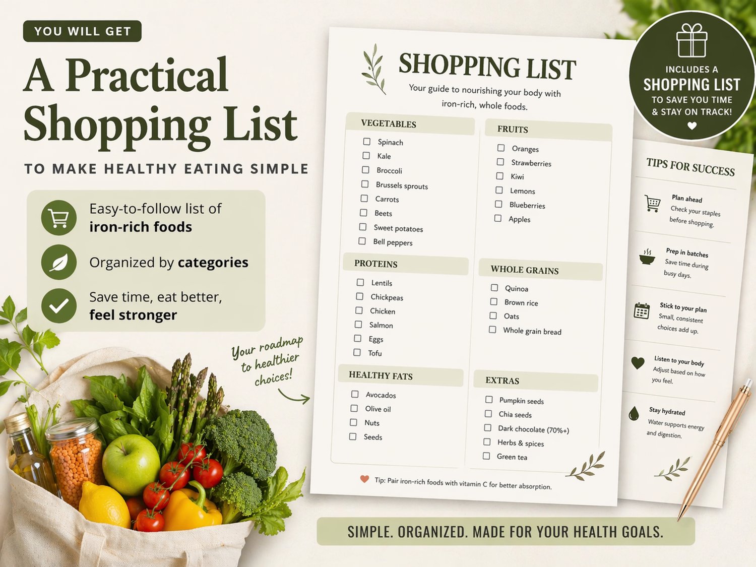 Simple meal guidance — nourishing foods (not rules), with vegetarian and meat options, plus iron-supportive choices for low energy.