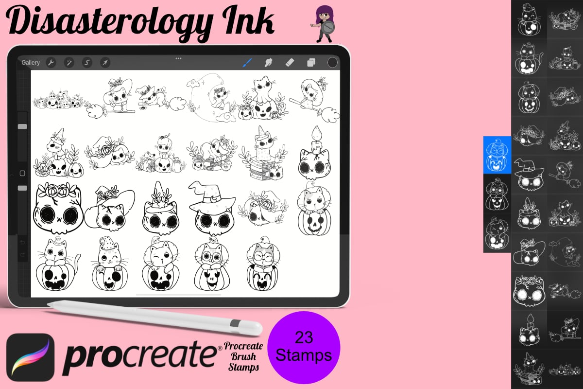 Pack of 23 Halloween cat Procreate Stamp Brushes! These cute cate stamps are perfect for making illustration projects or any procreate purpose. You can use these in any colour or opacity and they can be resized to best fit your art. You need Procreate 5.0.8 or 5X, an iPad, and an Apple Pencil. Also, these stamp brushes are not pressure sensitive and can be used with third party stylus, Apple Pencil or even your finger. You can change the colour, size and opacity of these stamps.
