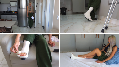 Hannah just got home with a fresh cast. She takes pain medication and cleans her toes. Then she lies down in bed, massages her foot, and takes a nap, as her day has been very hectic and tiring.