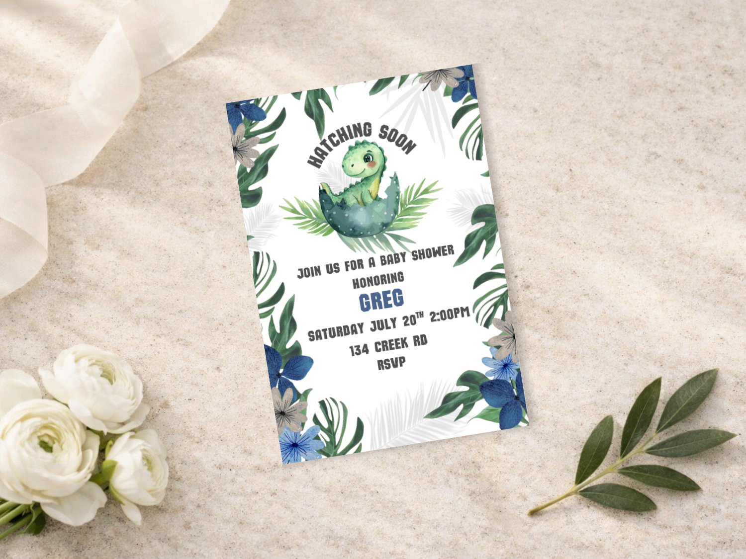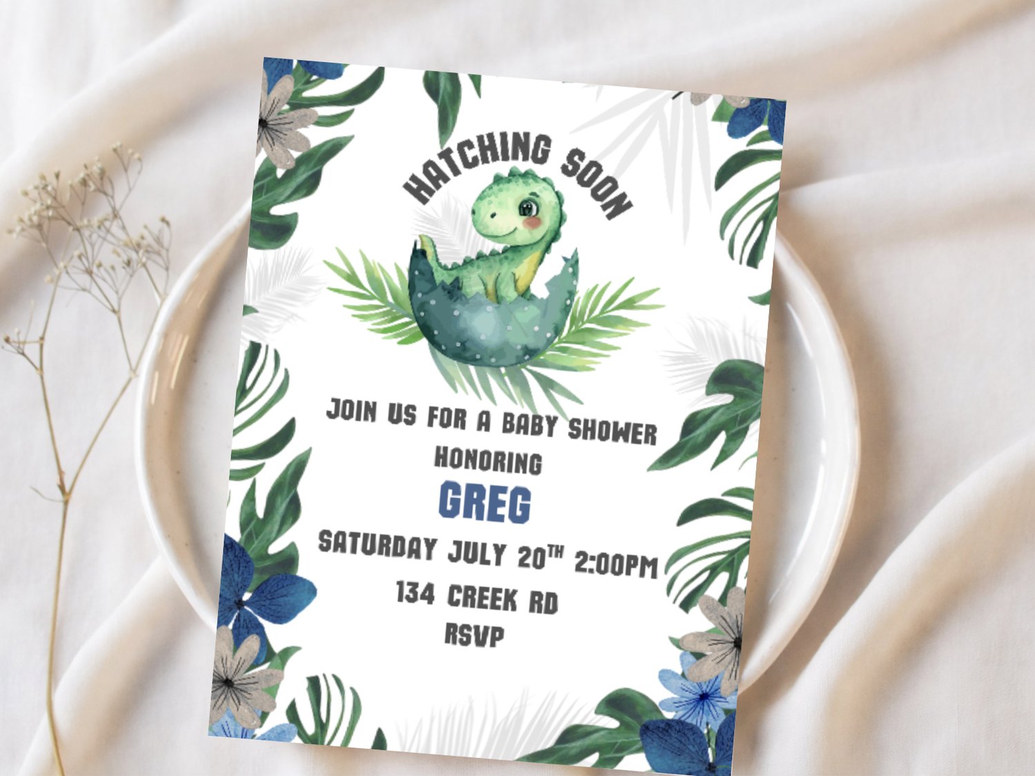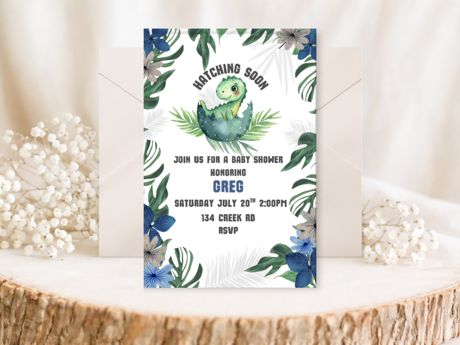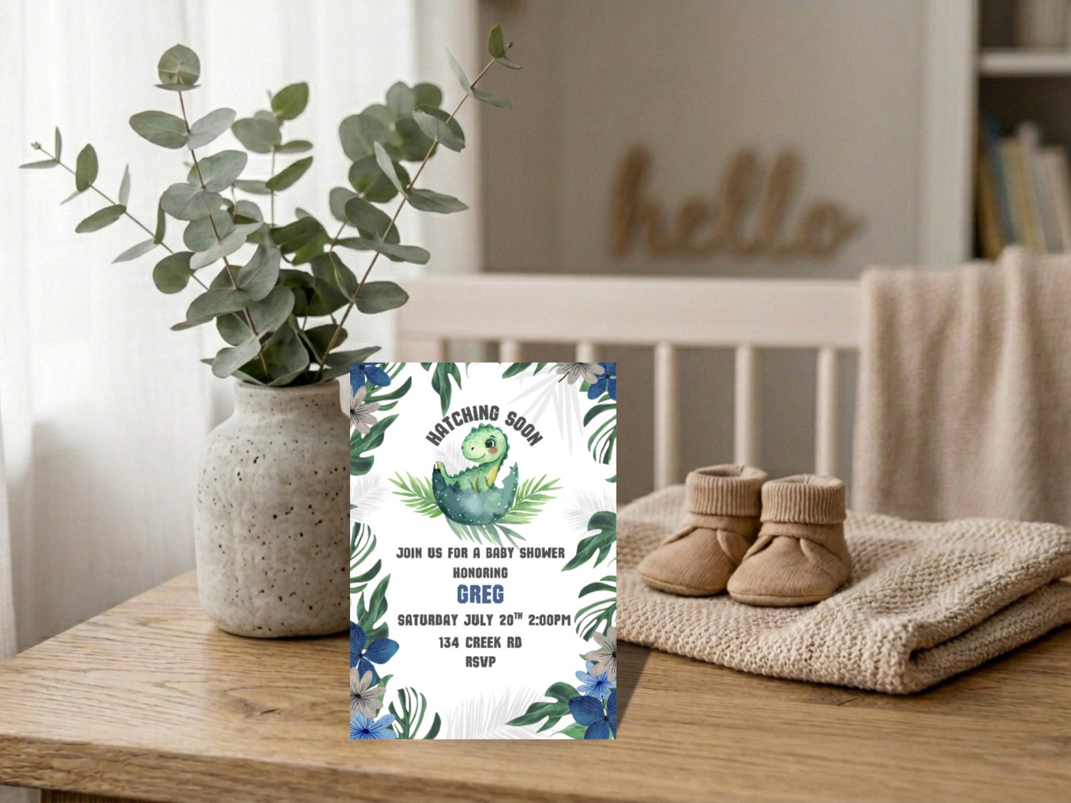 Editable Hatching Soon Dinosaur Baby Shower Invitation – Baby Boy Theme
