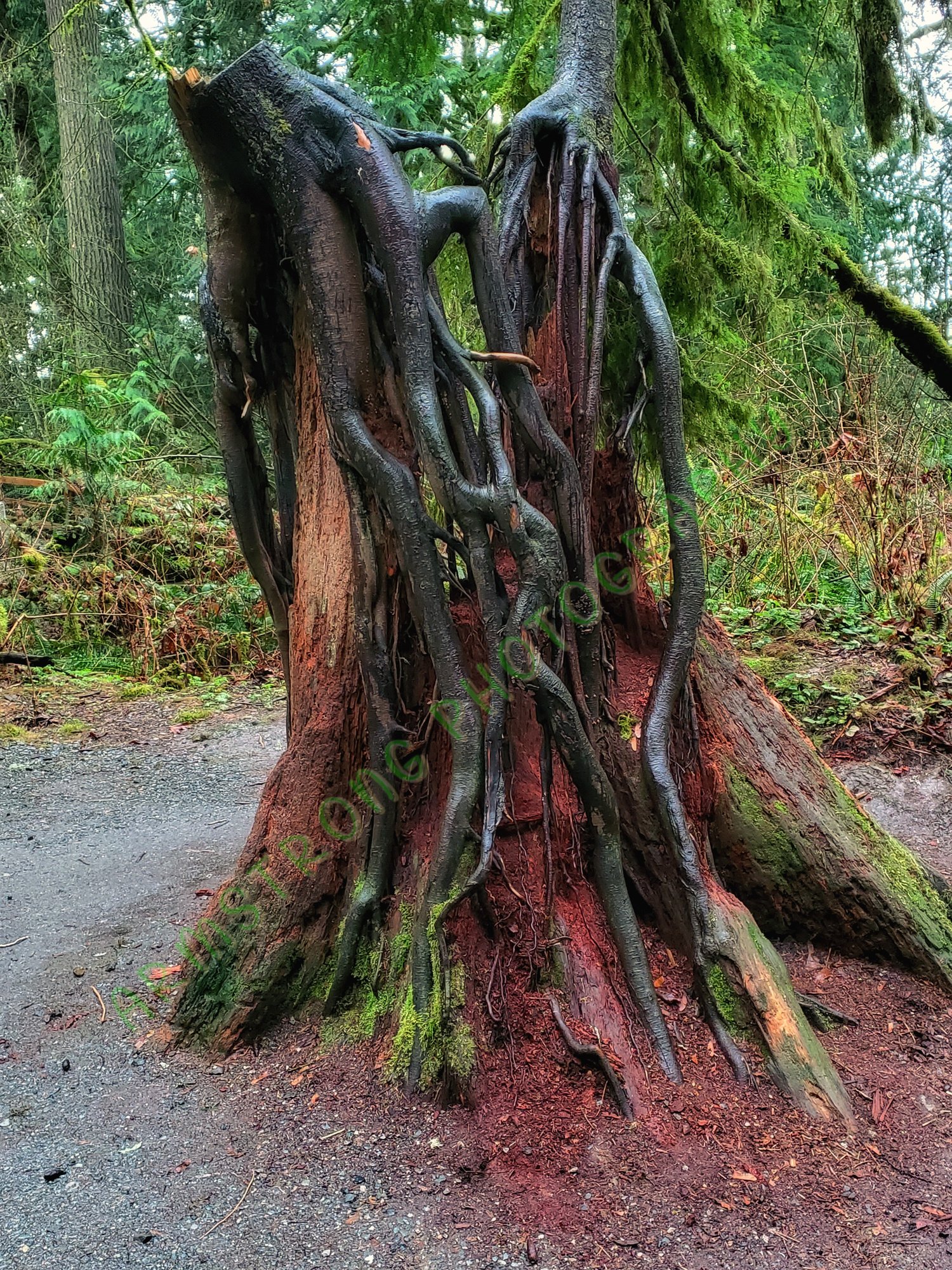 A random tree in a forest somewhere in Washington. The forest had experienced a severe storm and this is what was left of this cut down tree.