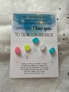I love you to the moon and back worry pebbles small gift. 2 background colours to chose from – blue and white or pastel colour. A6 in size with 5 worry pebbles included. Physical item.