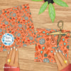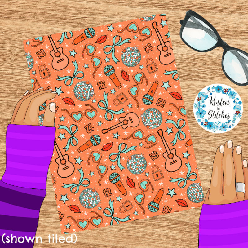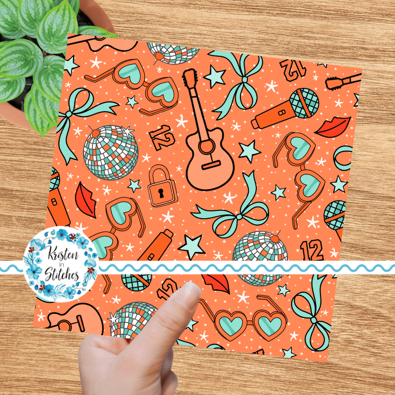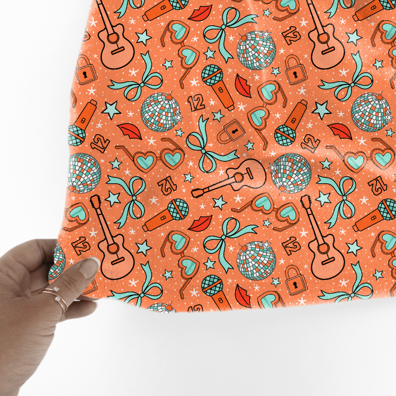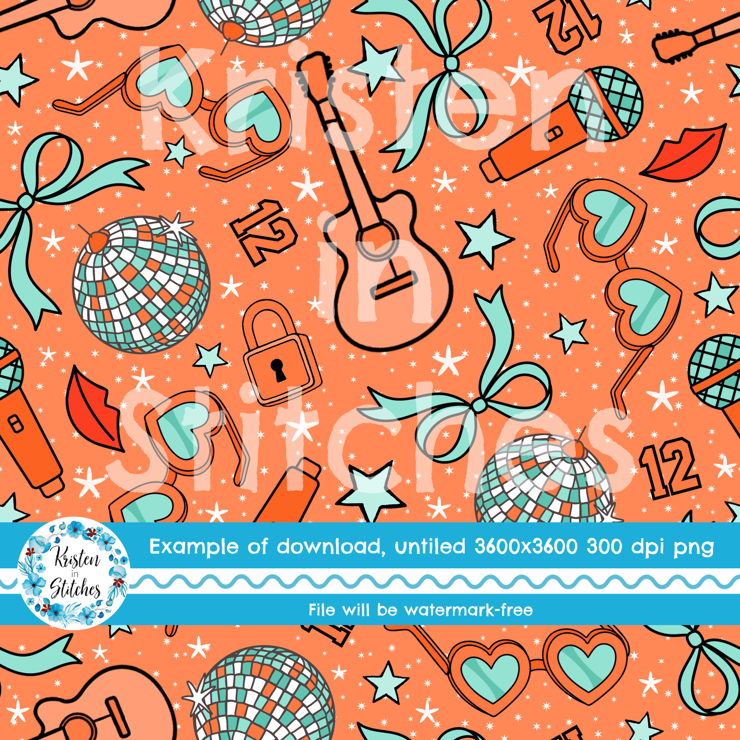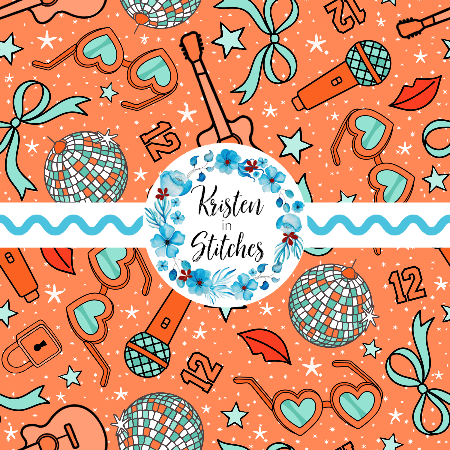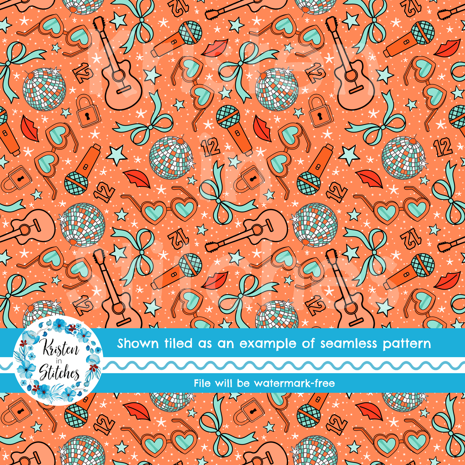 Life of a Showgirl icons in orange and mint green album colors, including disco balls, guitars, orange locks, microphones, coquette ribbon bows, lipstick and more.