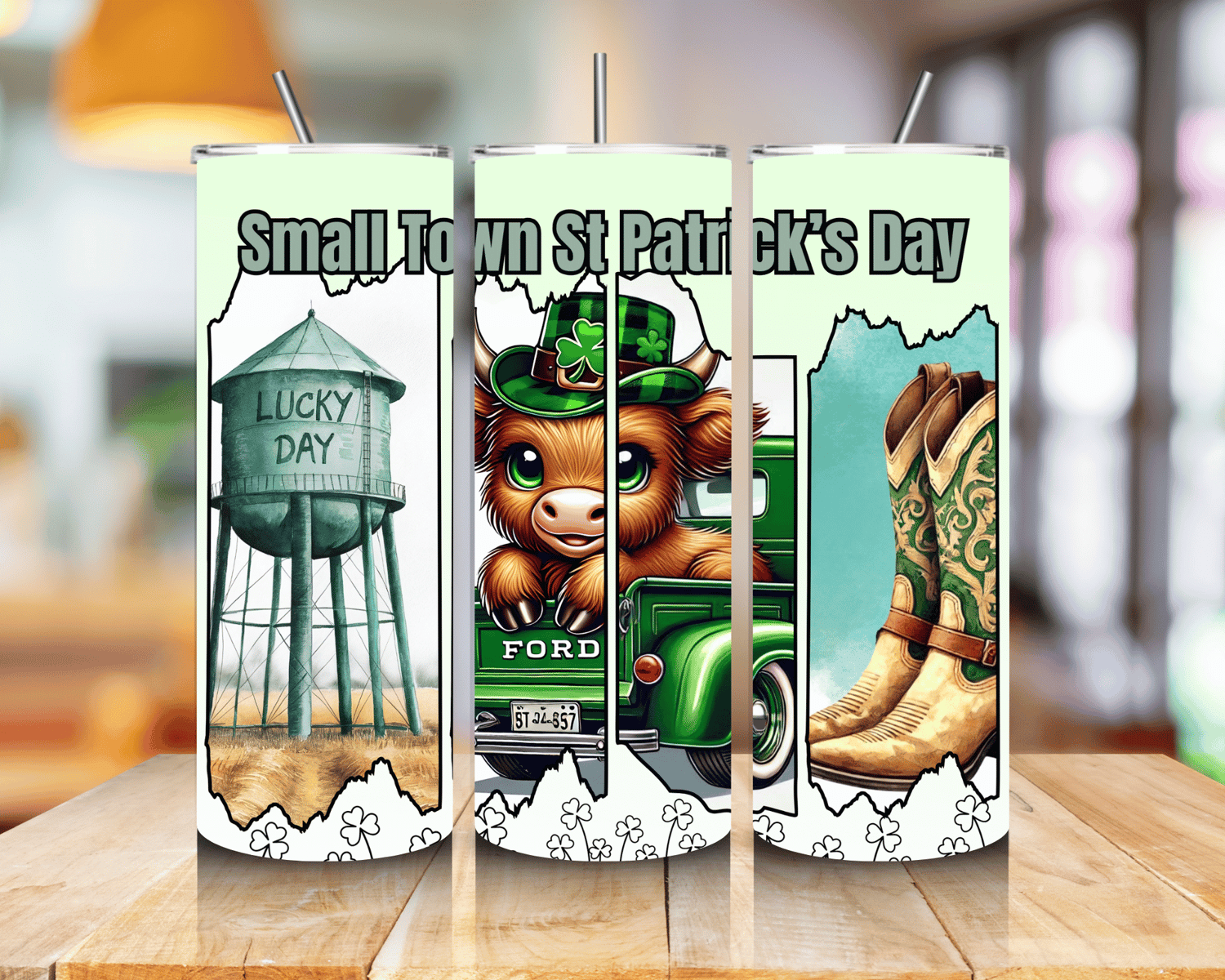 This original digital tumbler design captures the charm of a small-town St. Patrick’s Day celebration with a rustic country twist. The artwork features a vintage-style water tower labeled “Lucky Day,” a cute Highland cow riding in a classic green pickup truck, and a pair of detailed western boots—each element framed to reflect hometown pride and festive spirit. Soft green tones, shamrock accents, and nostalgic imagery bring together country living and holiday cheer in one cohesive design.