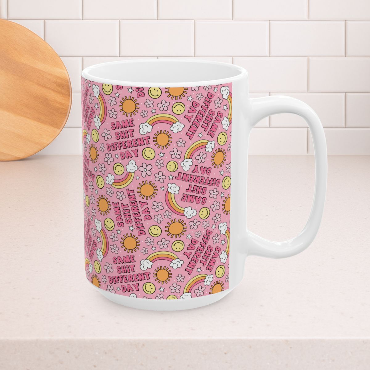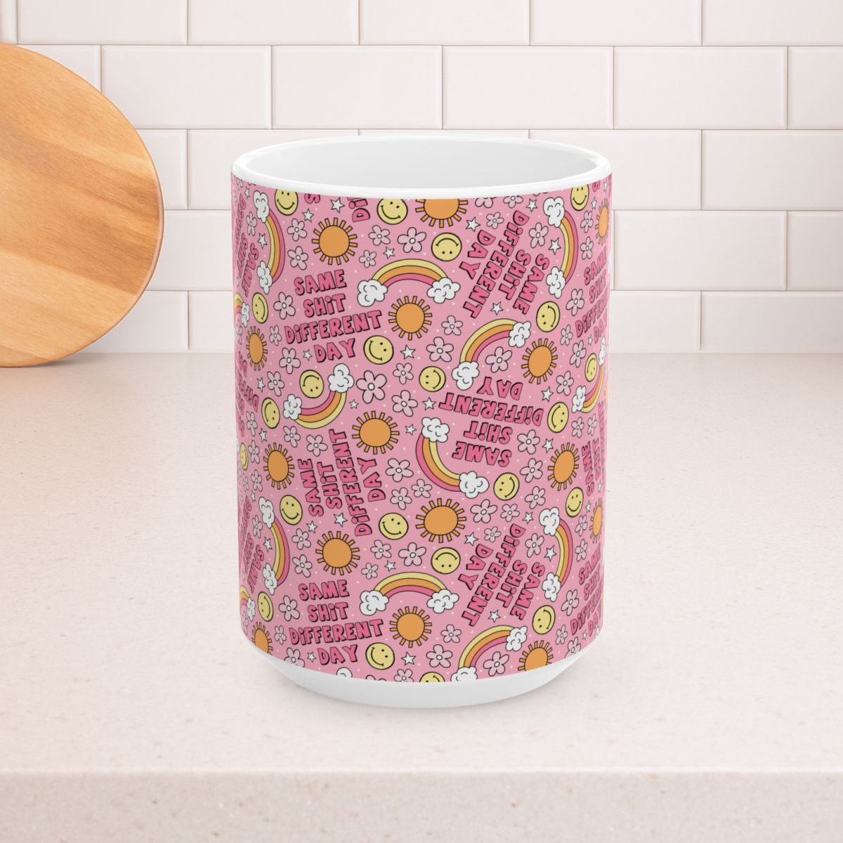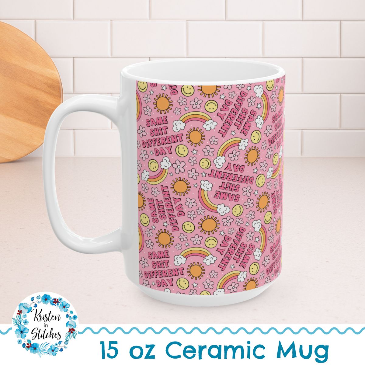 Same Shit Different Day 15oz Ceramic Mug, Large Coffee Cup, Swear Words, Pretty Profanities, Rainbows