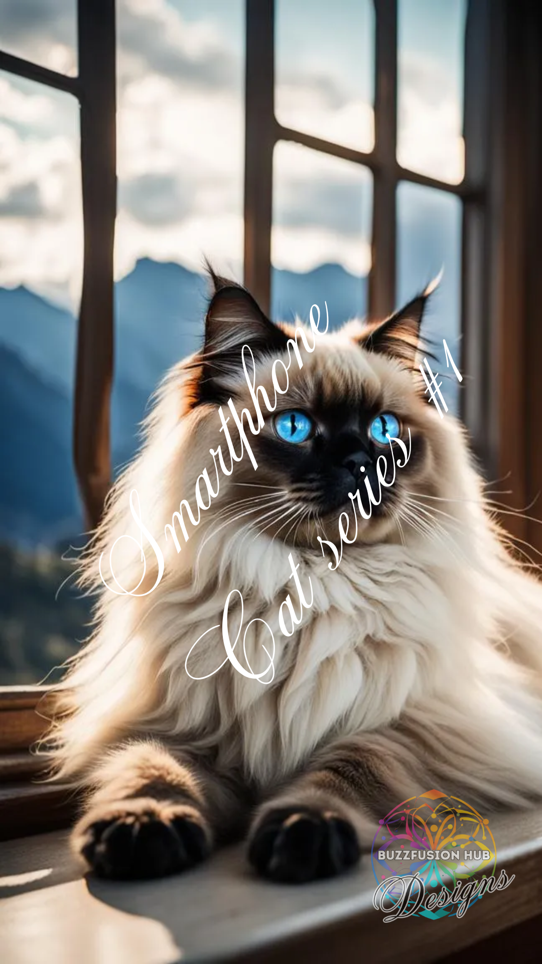 Description: Immerse yourself in the serene beauty of this professional photograph featuring an enchanting Himalayan cat. With its luxurious, fluffy coat and deep blue eyes, the cat is comfortably lounging on a windowsill, offering a breathtaking view of distant mountains in the background. The hyper-detailed image, captured with a wide-angle lens and cinematic lighting, beautifully showcases the cat’s elegance and the tranquil mountain scenery.