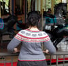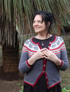 This is a pattern for a circular yoked cardigan worked from the top down and using the Fair-Isle colourwork technique and a centre steek.