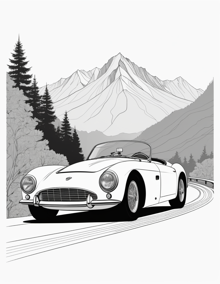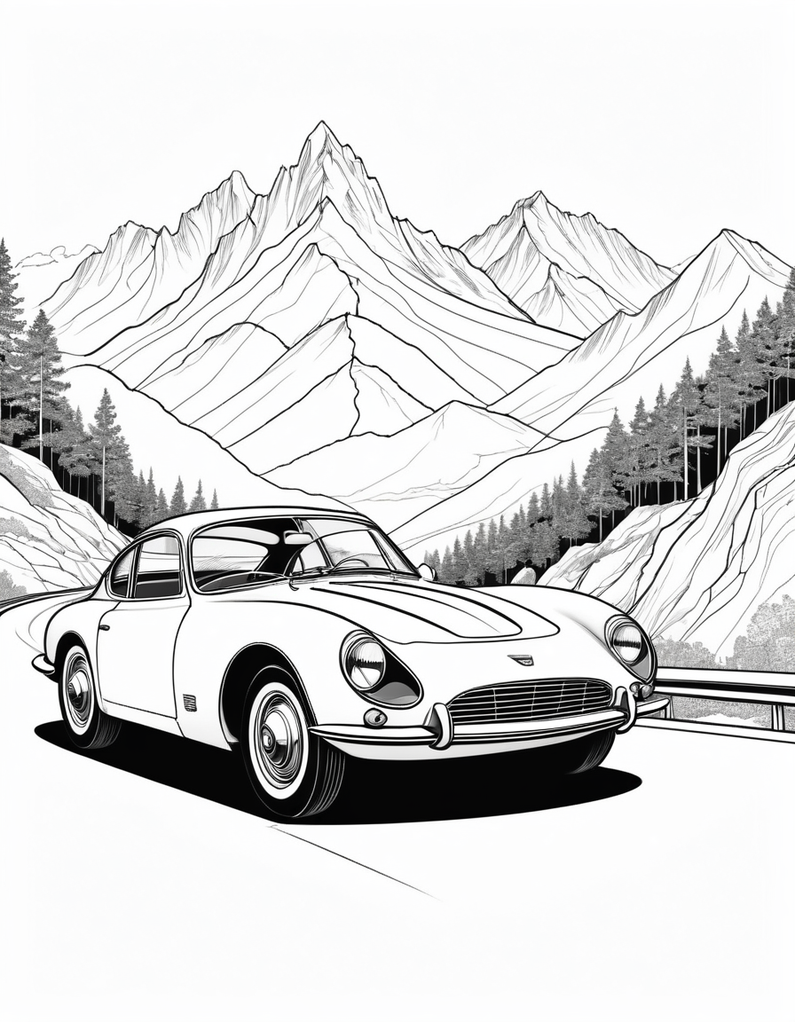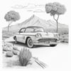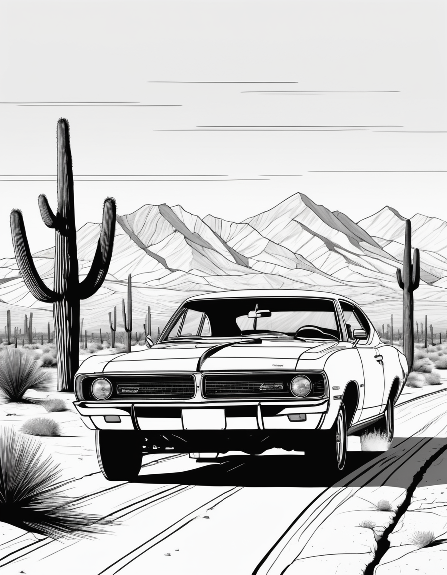 - 8 Detailed Line Art Pages: Featuring vintage and classic cars, each surrounded by captivating landscapes, including desert roads, mountain backdrops, and scenic cityscapes.