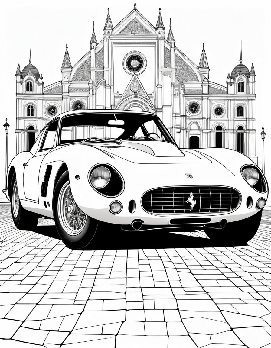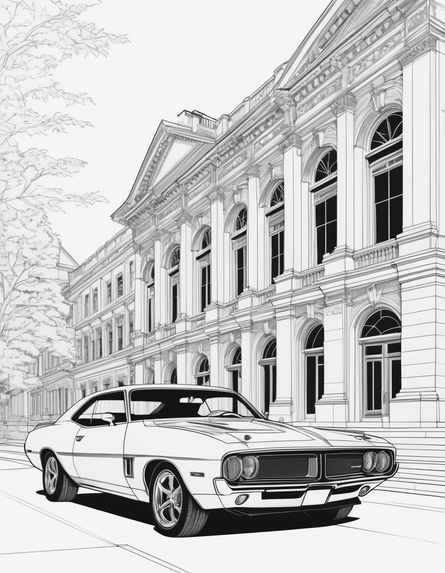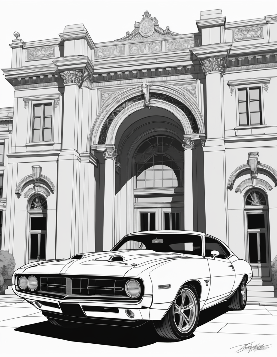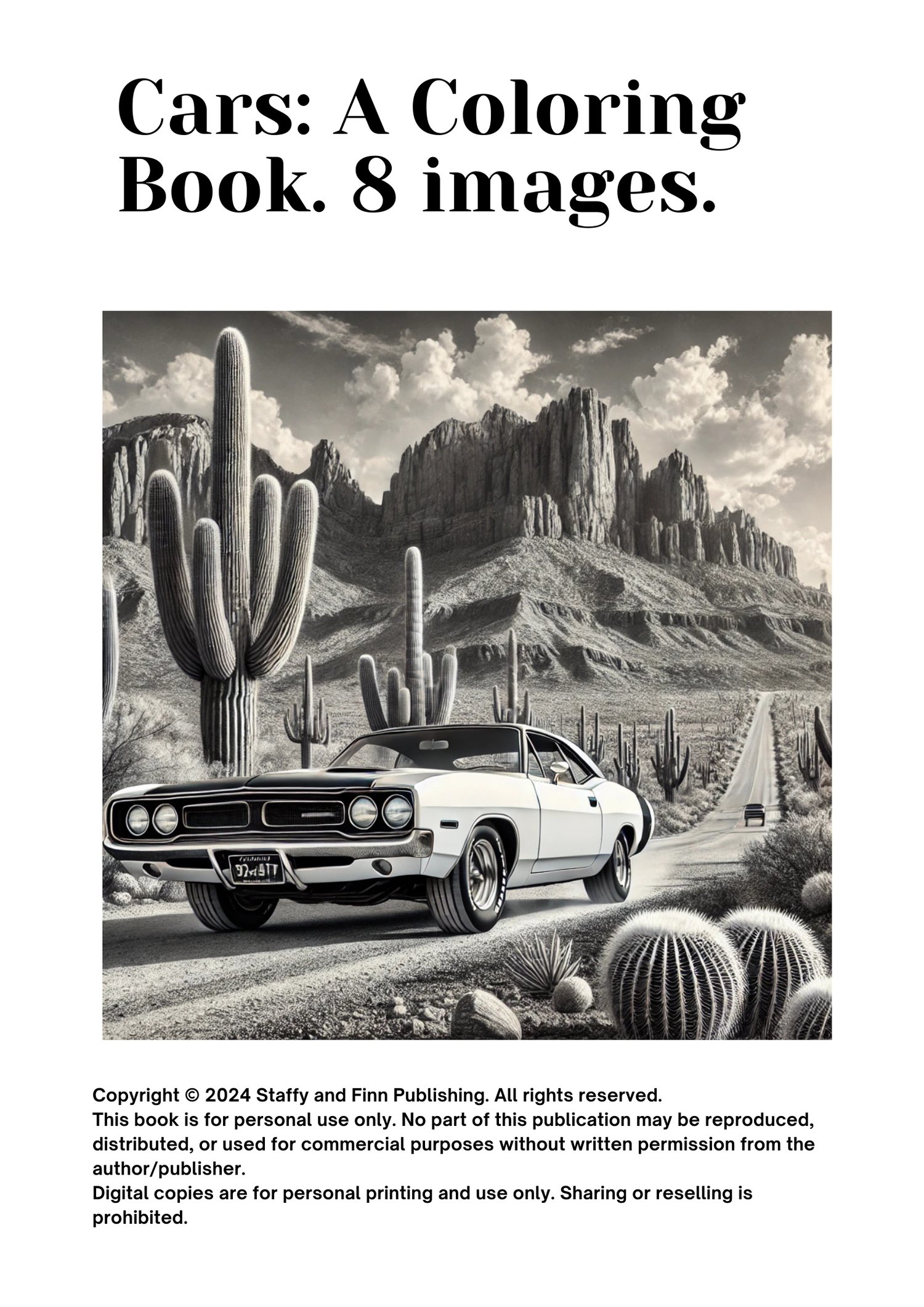 - 8 Detailed Line Art Pages: Featuring vintage and classic cars, each surrounded by captivating landscapes, including desert roads, mountain backdrops, and scenic cityscapes.