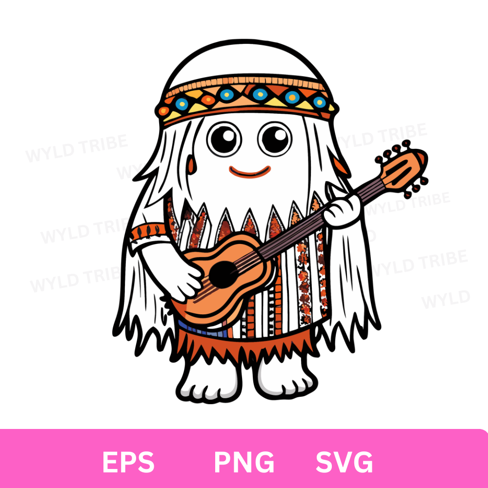 A Cute Hippie Halloween Ghost With An Adorable Guitar And Hippie Outfit