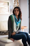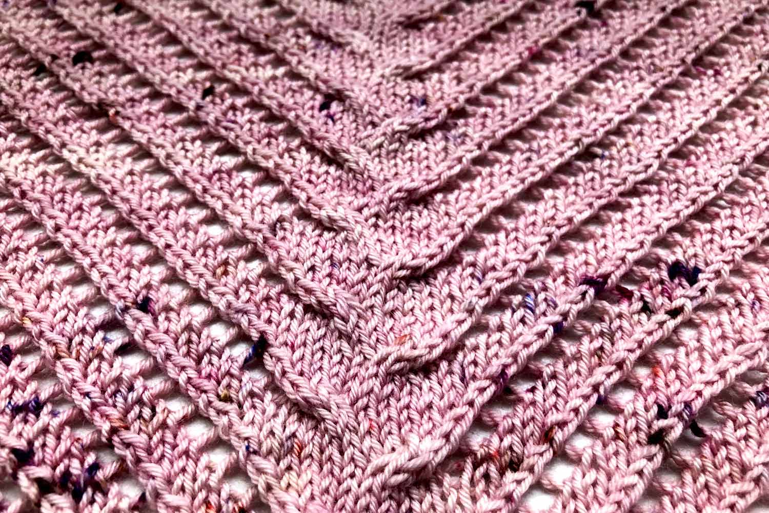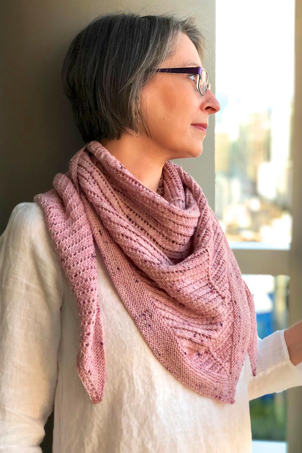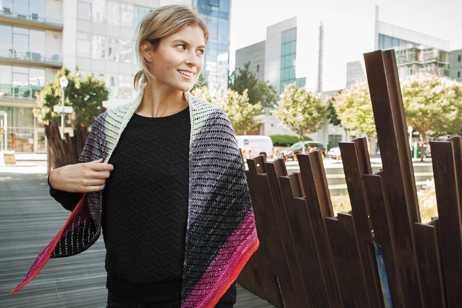 Eyelet diagonals set at cross-purposes to the cables and central spine bring a fresh energy to this top-down triangle. Using fingering weight yarn, show off the vibrant hues of gradient colourways or highlight the strong geometry of a solid colour.