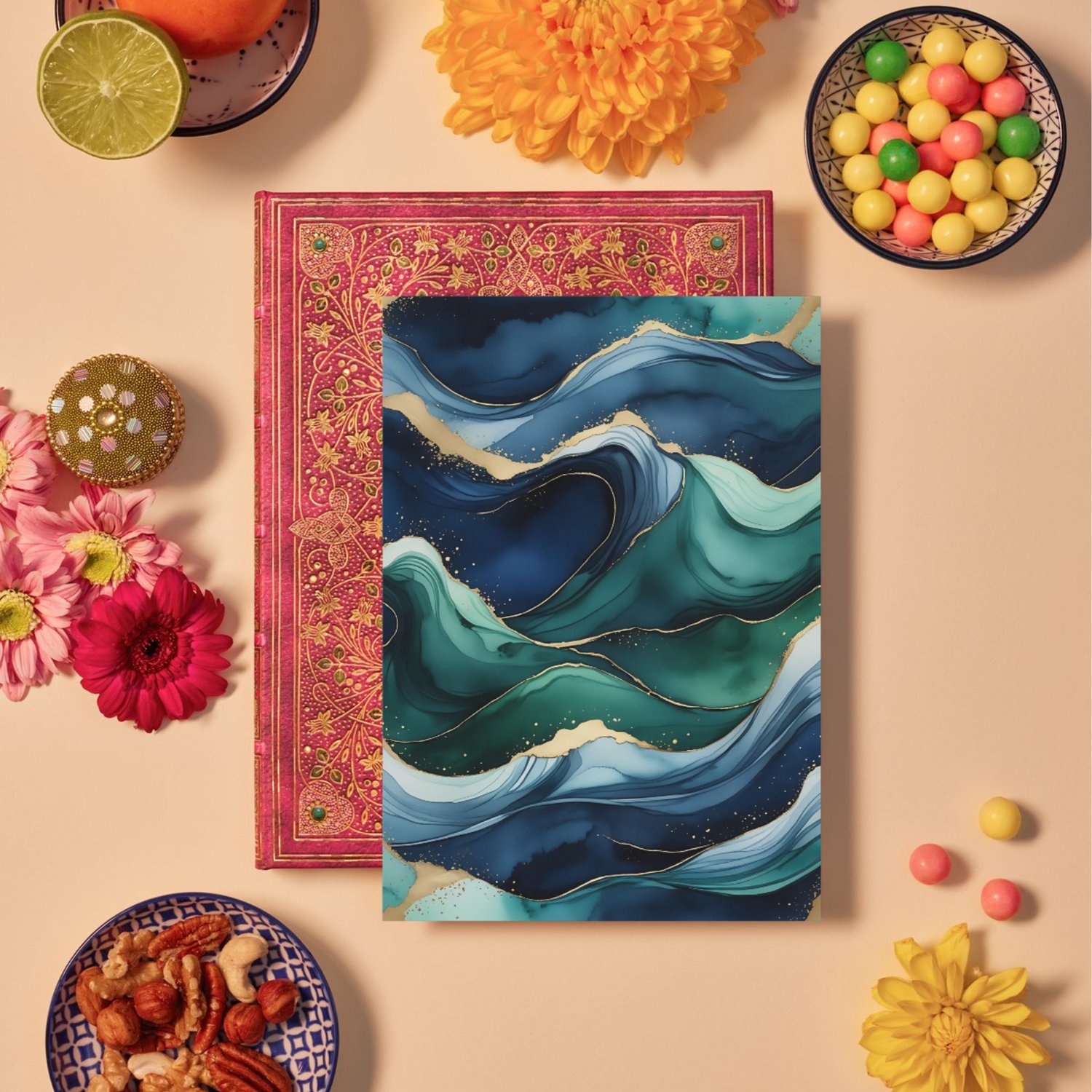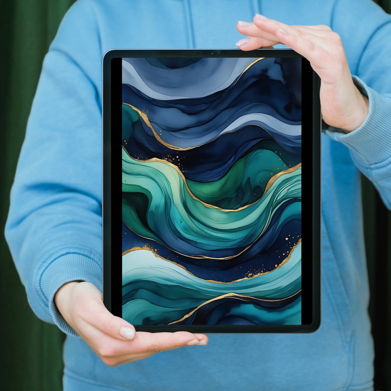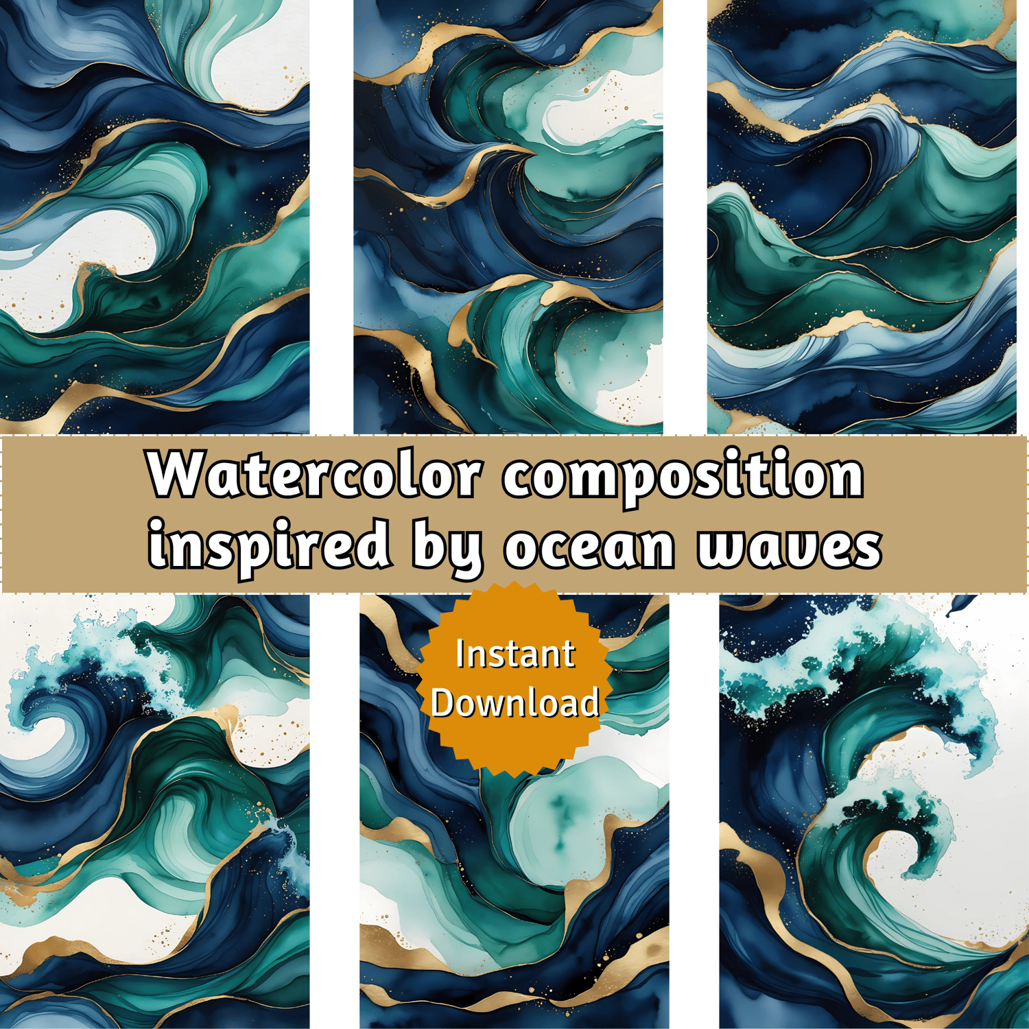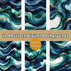 Create stunning designs with ease using this set of 12 high-quality abstract watercolor backgrounds. Inspired by the mesmerizing movement of ocean waves, these seamless digital designs feature deep navy blue, rich emerald green, and hints of turquoise, blending effortlessly to create a fluid and organic aesthetic. Gold metallic accents shimmer along the edges, adding a luxurious touch, while the subtle texture mimics high-quality watercolor paper for an authentic artistic feel.