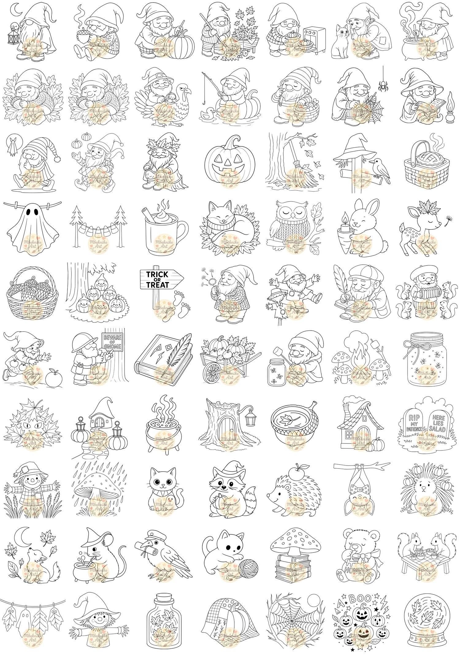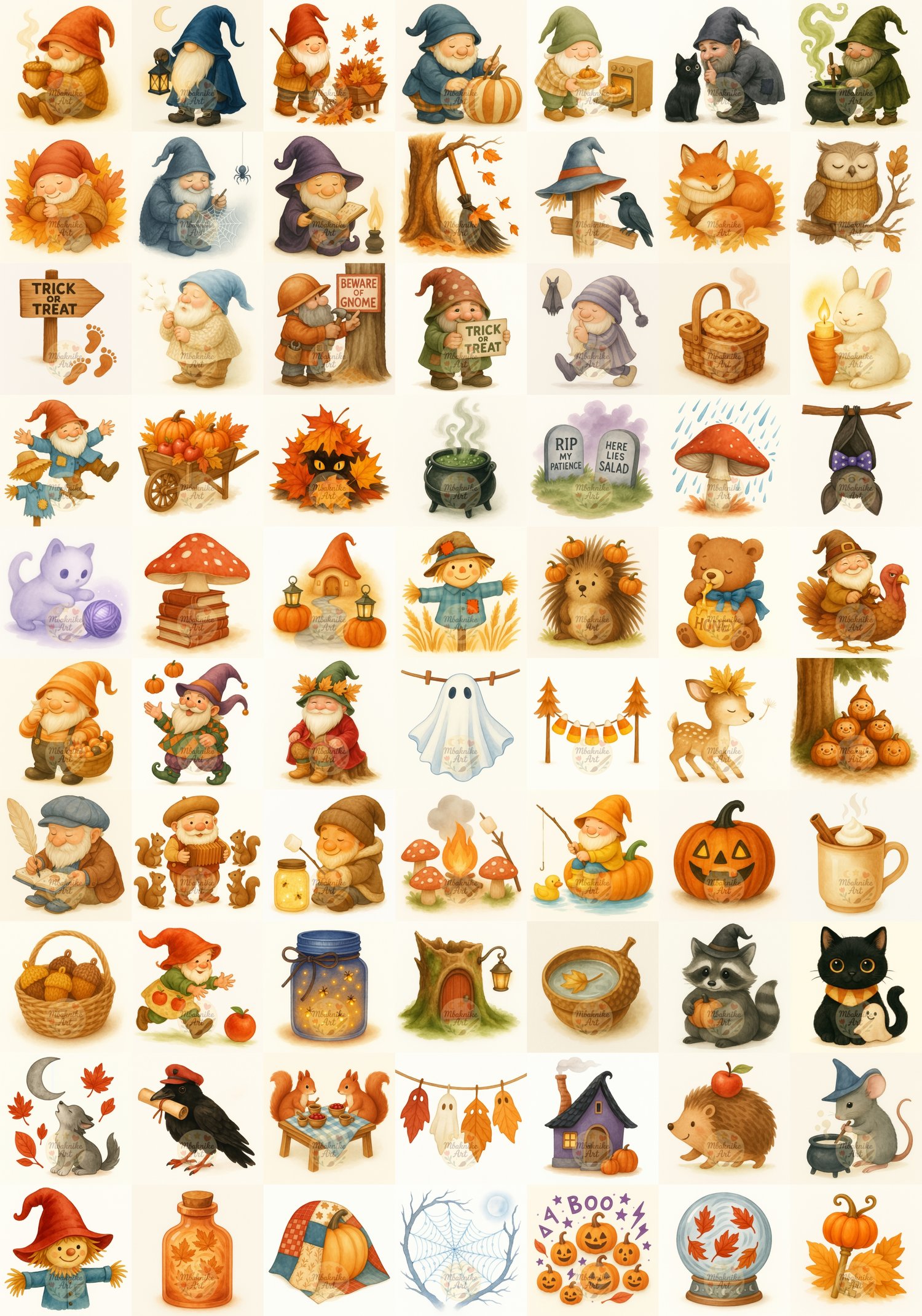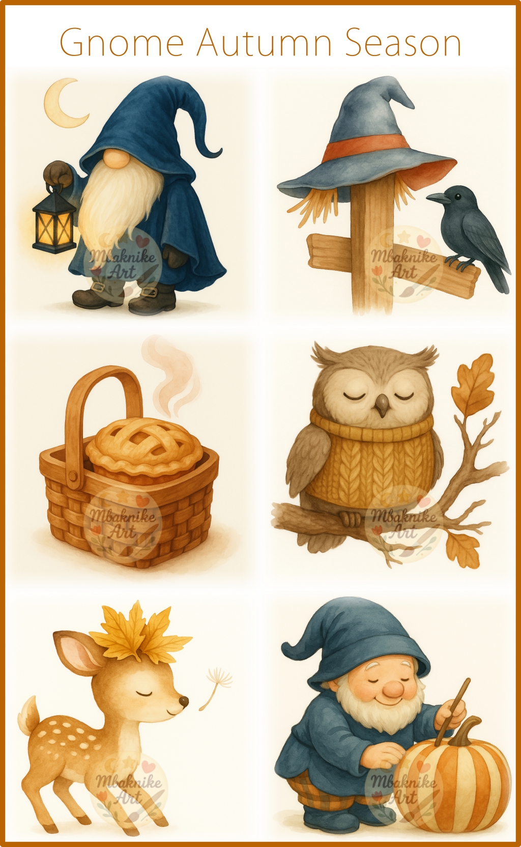 - 60 Clipart Images JPEG format · 2048 x 2048 px · 120 DPI Featuring charming gnome characters dressed in fall sweaters, leafy hats, and patchwork aprons as they stir pumpkin pies, ride turkey steeds, prepare harvest tables, and celebrate twilight festivals with bats and owls. Accents like fall signs, stacked books, enchanted snow globes, and rustic carts deepen the seasonal tale.