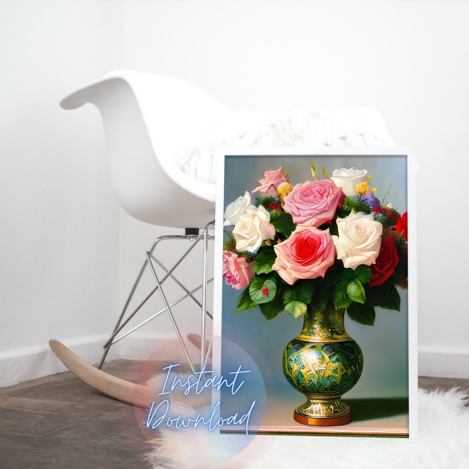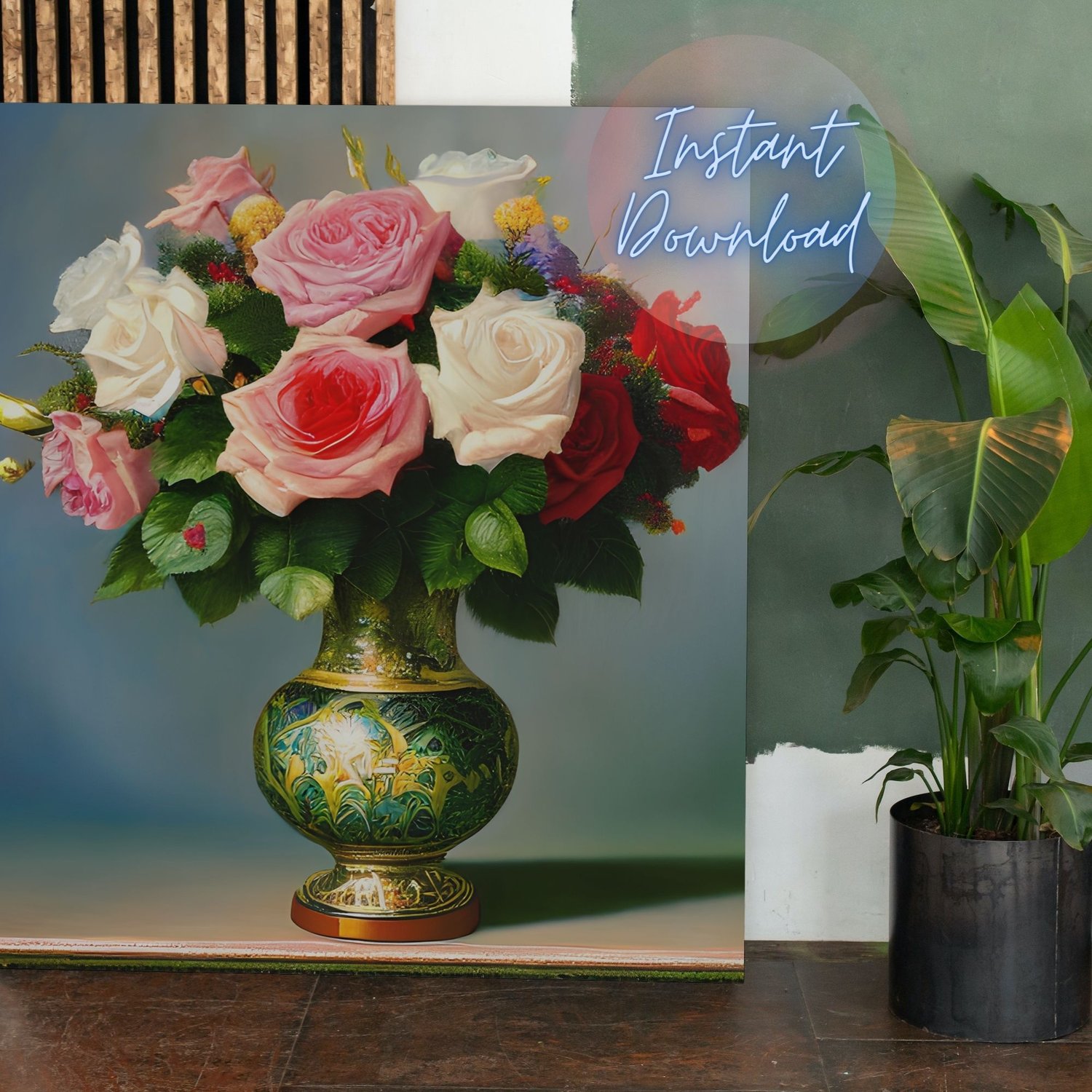 This digital oil painting of a beautiful bouquet of roses in a green vase is perfect for adding a touch of elegance to your home decor. This high-quality print is ready for instant download, and the five scalable JPEG files provided make it easy to print at home or at a local print shop.