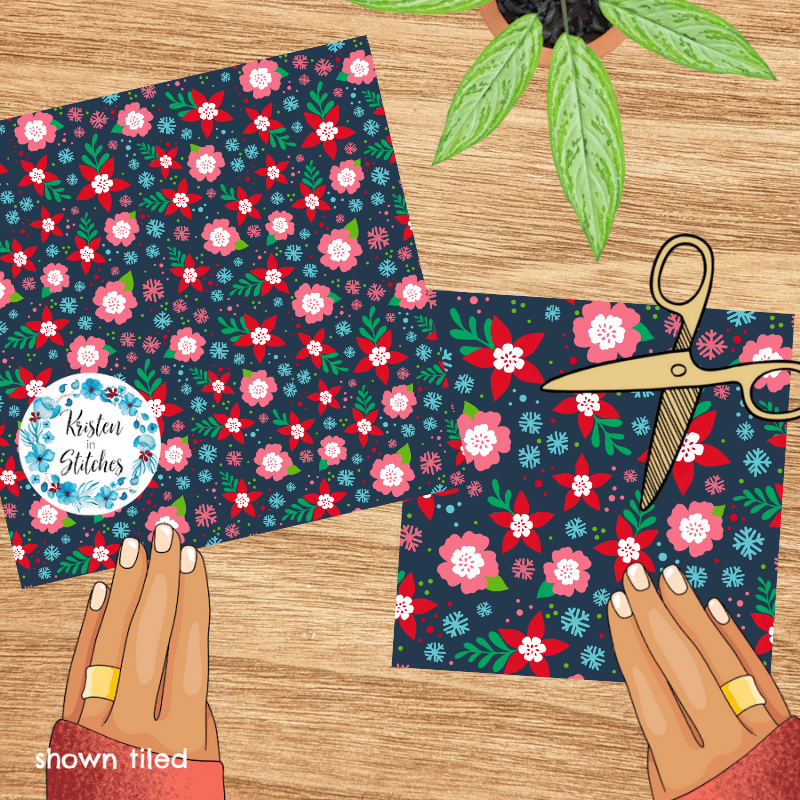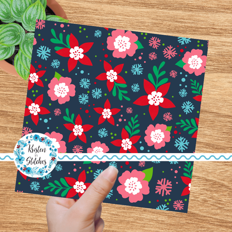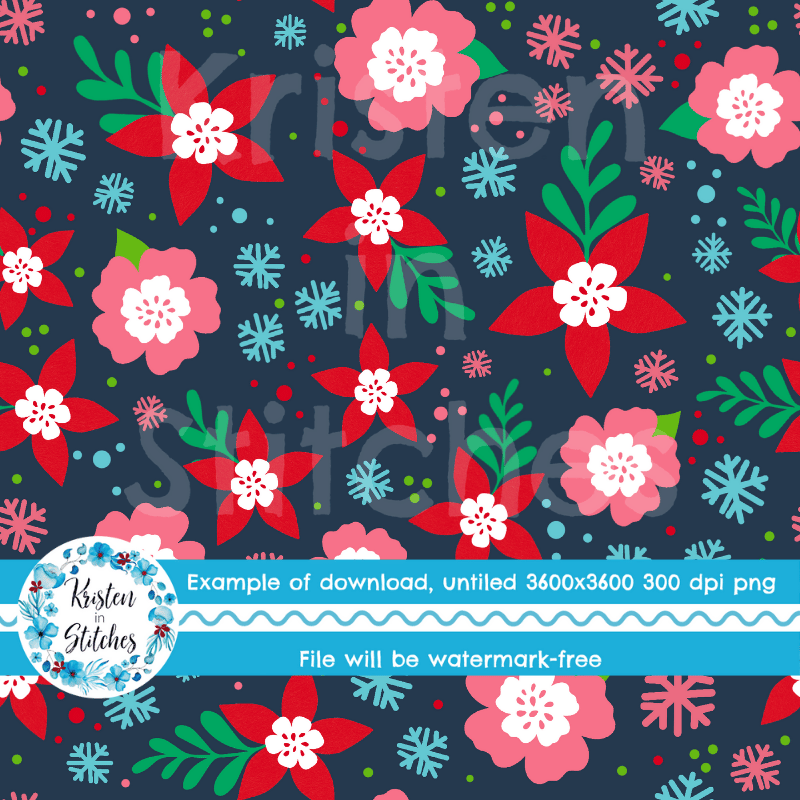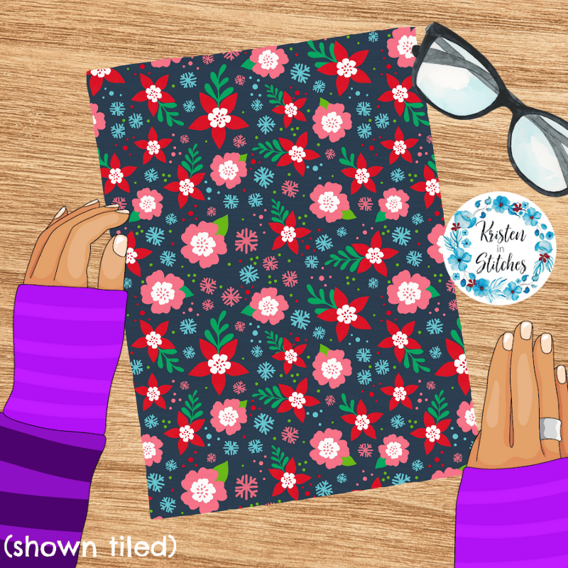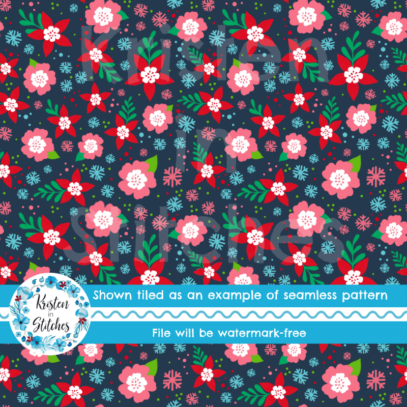 Festive Christmas Holiday Floral Seamless Pattern, Red and Pink Flowers, Navy