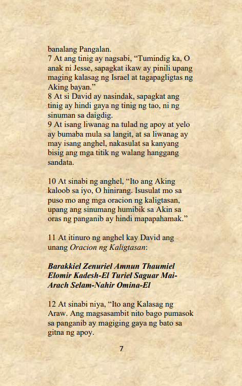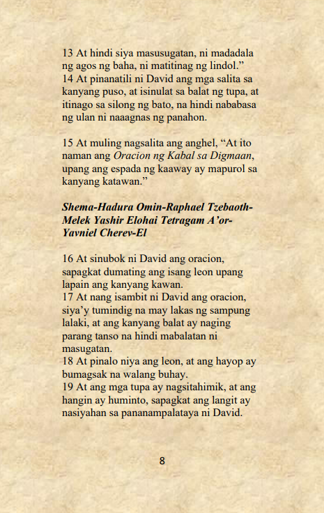 Sa loob ng labinlimang kabanata, matutunghayan mo ang mga mahiwagang pangyayari sa buhay ni David—ang kanyang pakikidigma laban sa mga masasamang nilalang, ang mga pagtataksil ng mga tao, at ang pagtanggap niya ng mga lihim na oracion sa Aramaic, Angelic Tongues, at Mistikong Wika. Ito ay mga panalangin at salitang may kapangyarihang: