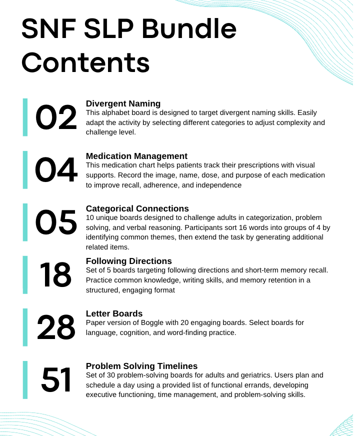 This printable therapy bundle is designed specifically for Speech-Language Pathologists working with adults in skilled nursing and rehab settings. Each worksheet provides functional, engaging activities to target cognitive-communication skills, language, and memory. Perfect for use in individual or group therapy sessions, these no-prep printables help streamline your caseload while keeping patients motivated.