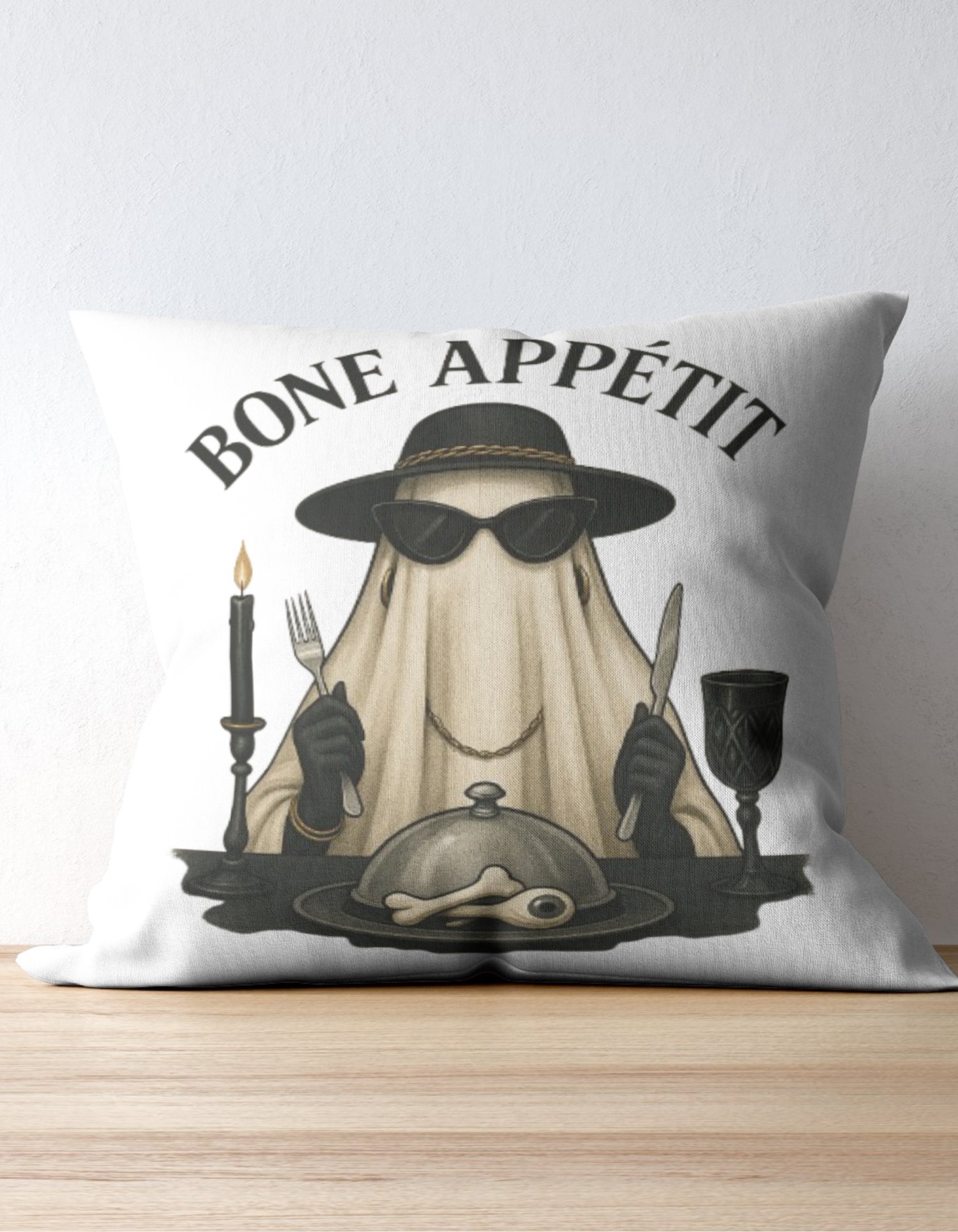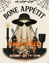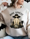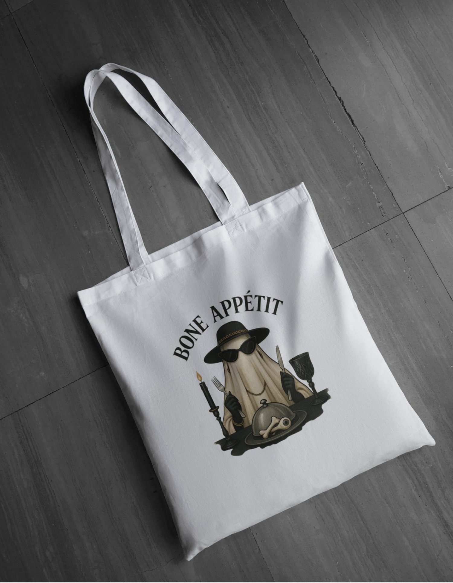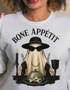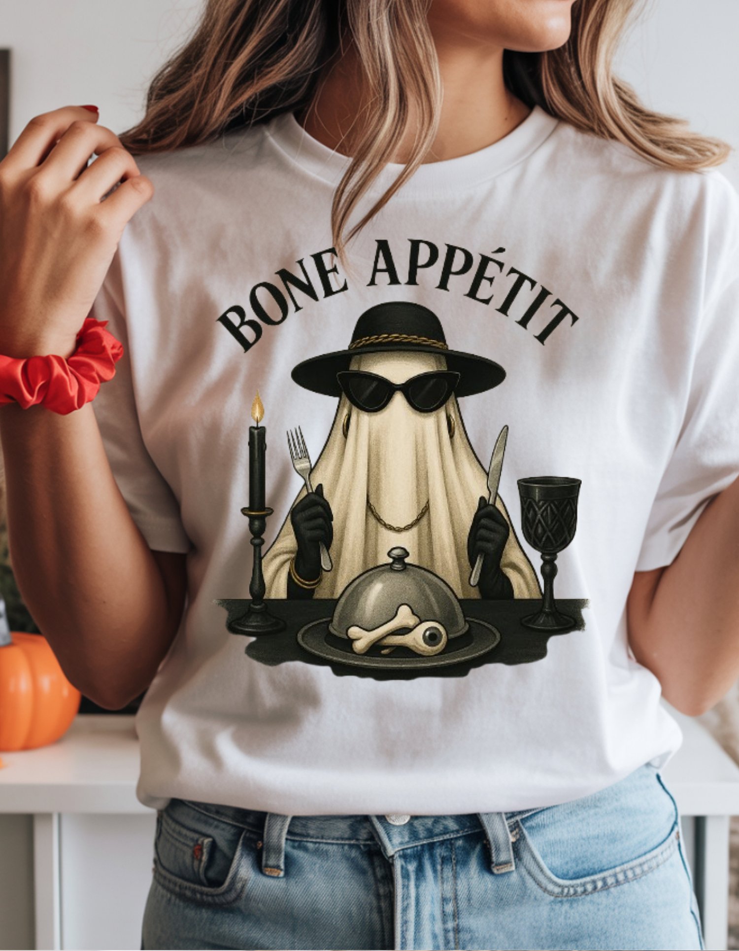 This high-quality design showcases bougie ghosts dressed to impress, serving up bone-chilling bites under candlelight. The phrase âBone AppĂ©titâ steals the spotlight, making this perfect for tees, totes, mugs, or party favors.