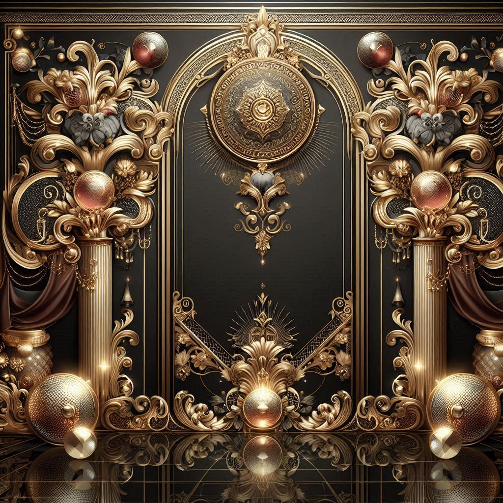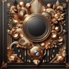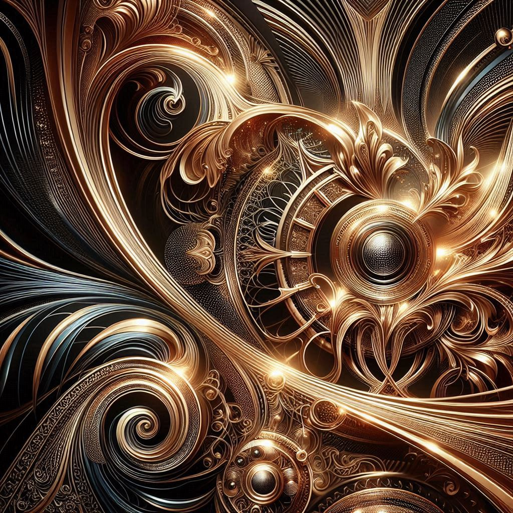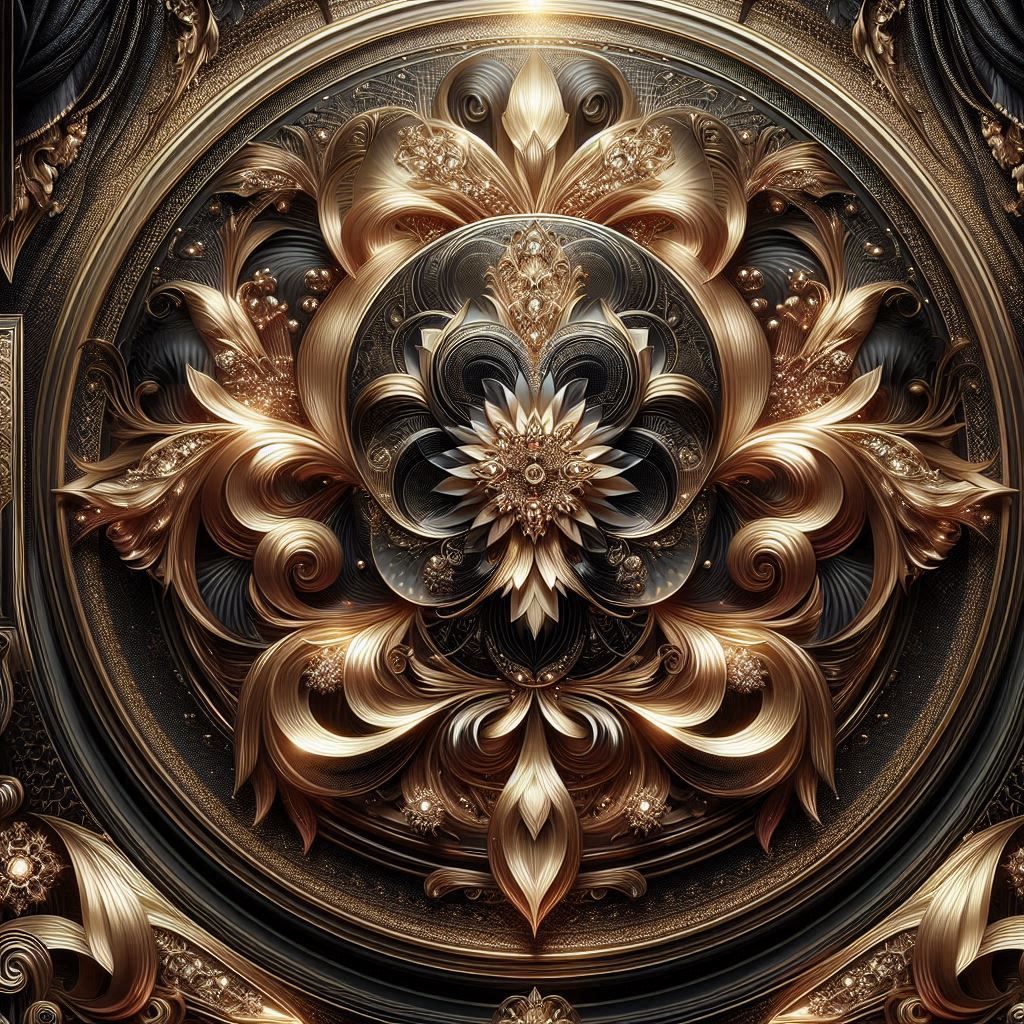The image displays a highly detailed and ornate piece of art featuring symmetrical and intricate patterns, resembling a mandala or emblem. The design is composed of various shapes and motifs that suggest floral and baroque influences, with a color palette dominated by shades of gold, brown, and black. This artwork is notable for its complexity, precision, and aesthetic appeal, making it suitable for decorative purposes or as inspiration for design projects.