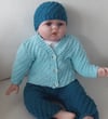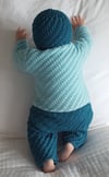 This babies Cardigan, with set-in sleeves, is worked in a diagonal rib. The pattern includes the option of both a round neck and V neck. It is photographed in size 0 months, along with the matching pants and beanie which are available separately (please see my Jory pattern for those).