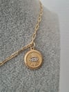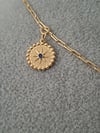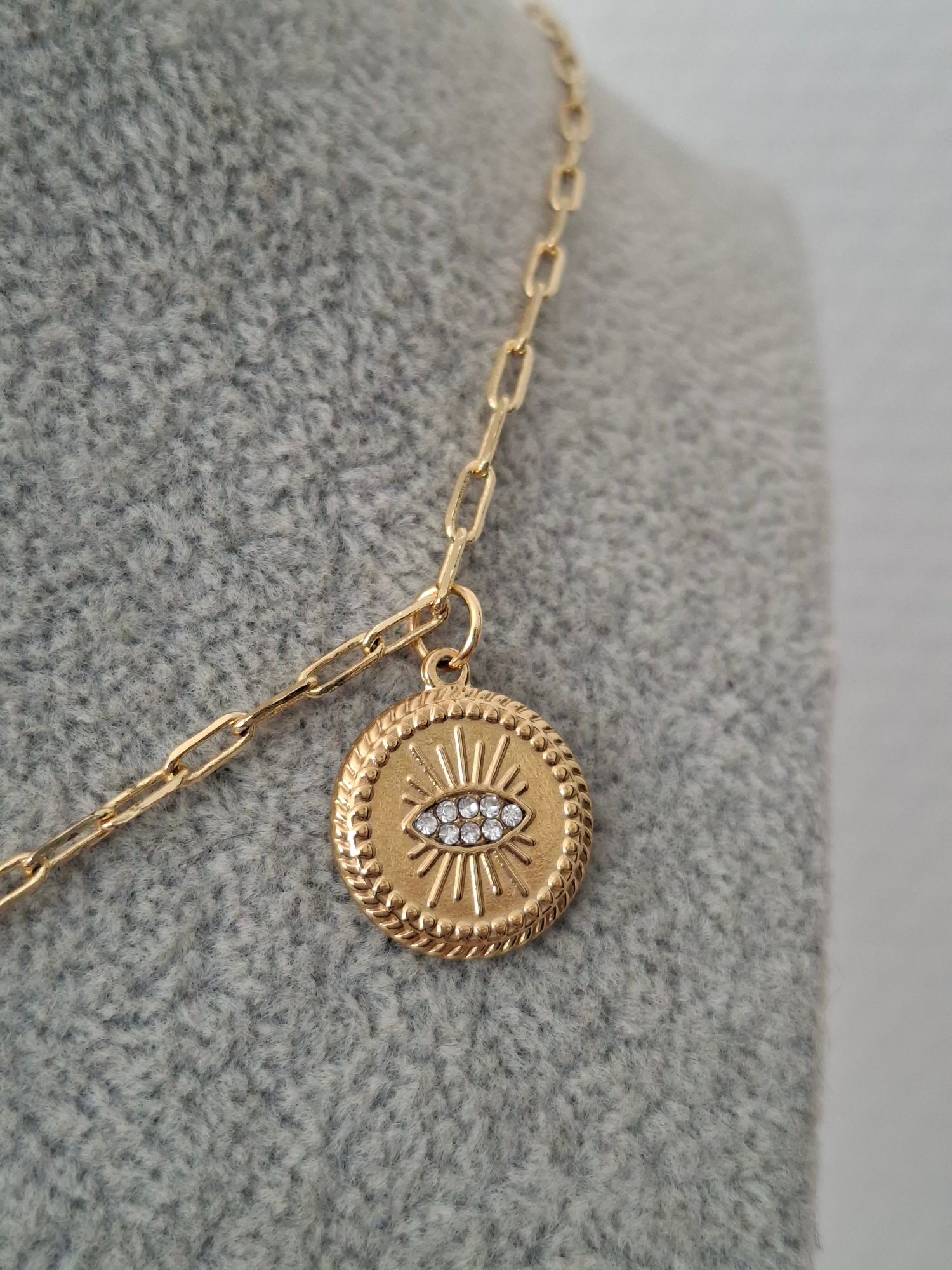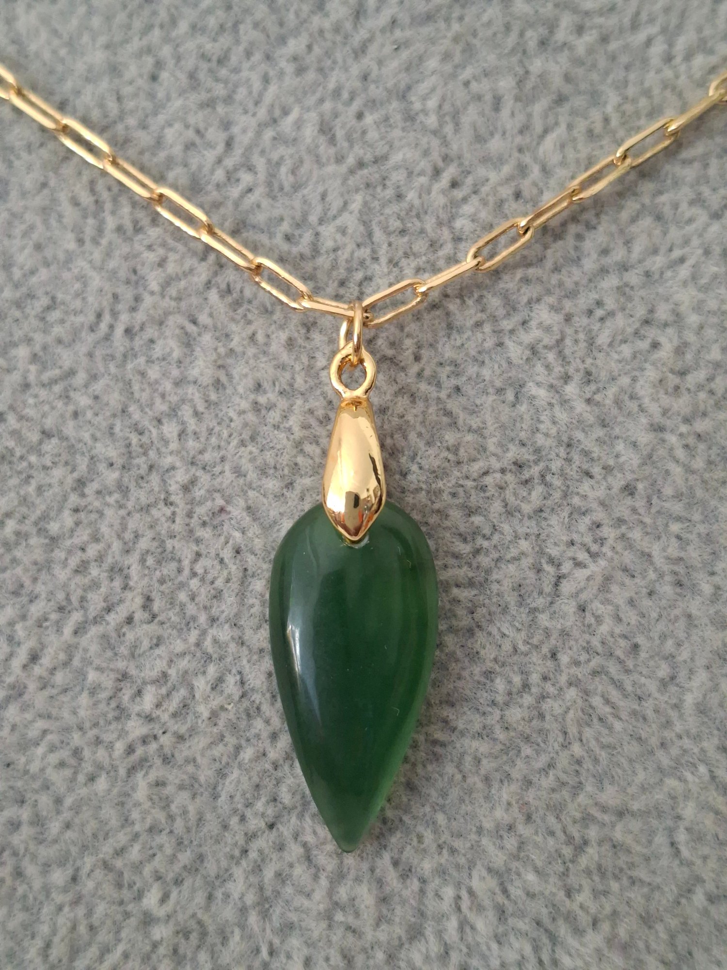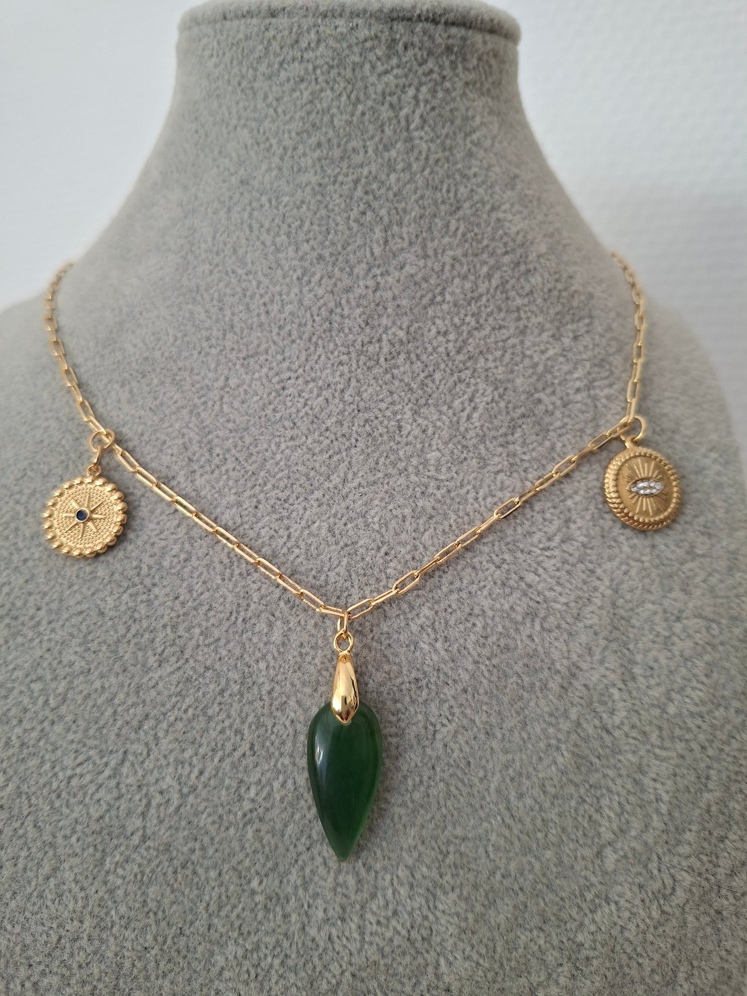 Un collier élégant et symbolique orné d’un pendentif en jade naturel en forme de goutte, accompagné de deux médaillons dorés aux motifs solaires. Un bijou qui incarne harmonie, équilibre et rayonnement.