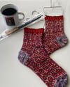 The Closed Circuit Socks pattern is a charted slip-stitch mosaic pattern consisting of an 8-stitch repeat. The sock pattern is written for toe-up socks using magic loop with an afterthought heel; however, the pattern can be converted into a cuff-down pattern knit on magic loop.