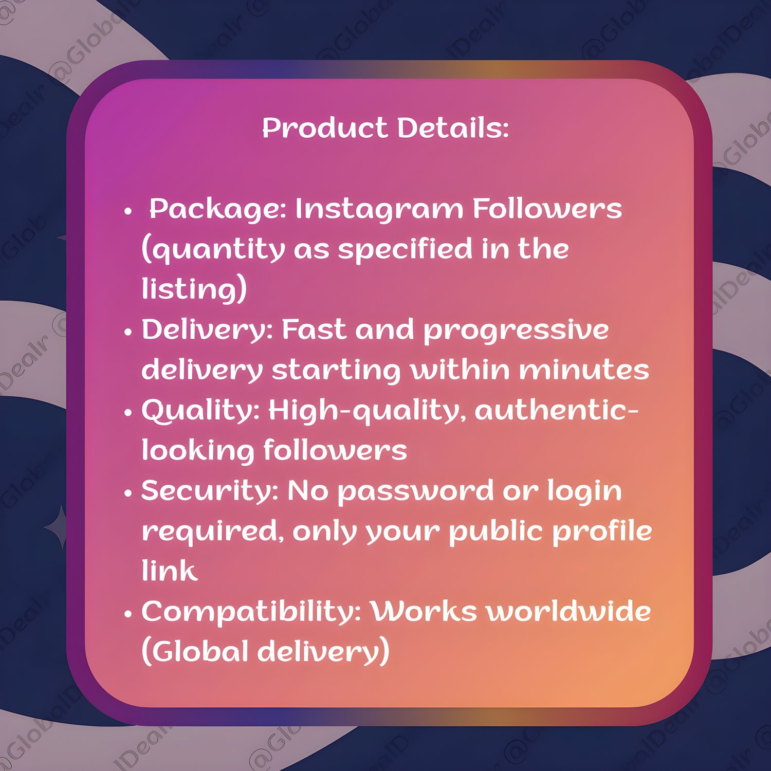 - Package: Instagram Followers (quantity as specified in the listing)