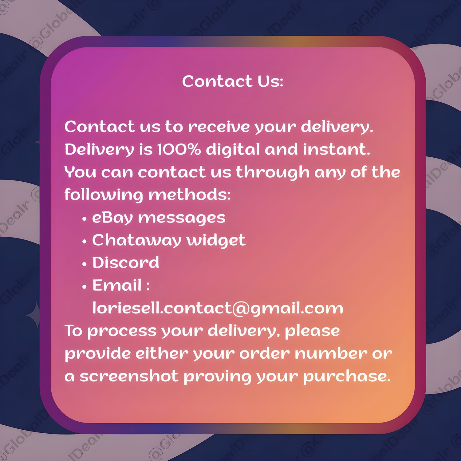- Send your Instagram profile link via eBay messages, chataway, discord or email: loriesell.contact@gmail.com