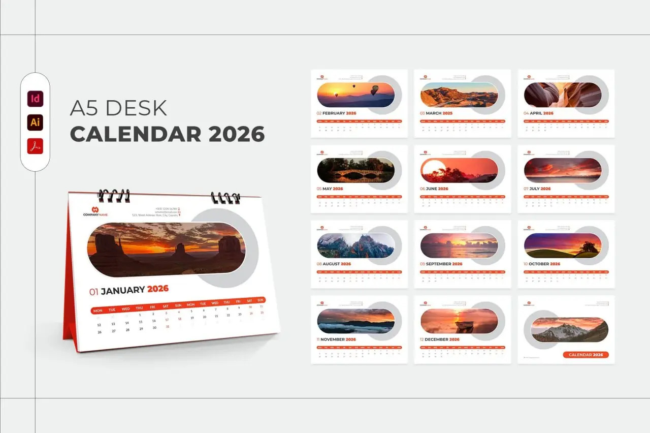 Plan your year with a clean and practical Desk Calendar 2026 template. Designed for everyday use, this calendar is available in multiple formats (INDD, IDML, AI, EPS, and PDF), making it easy to edit and adapt to your needs.