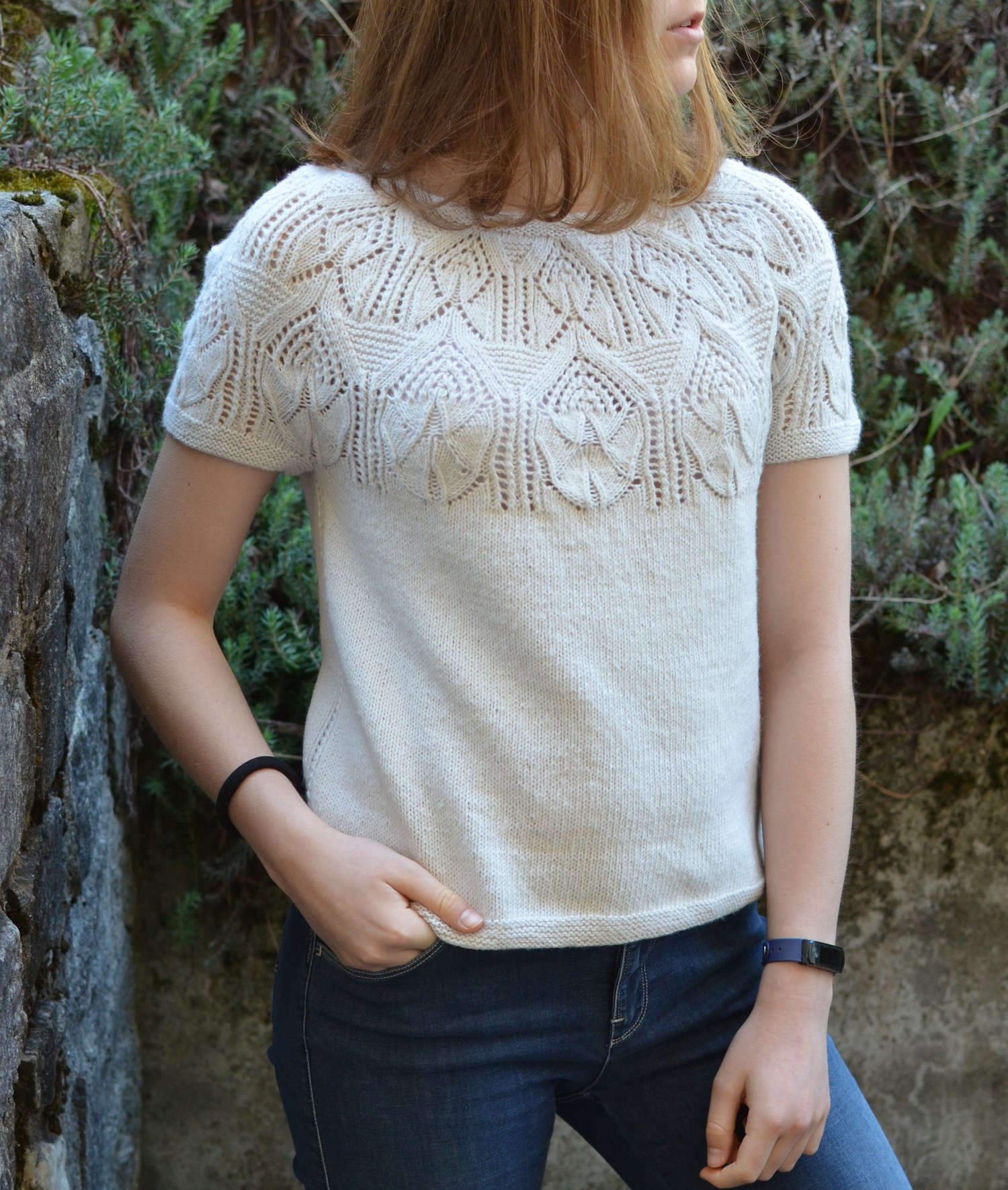 It is a seamless top-down tee with an interesting lace pattern on the round yoke and decent stripes of lace on the sides as mock seams to visually separate the back and the front.