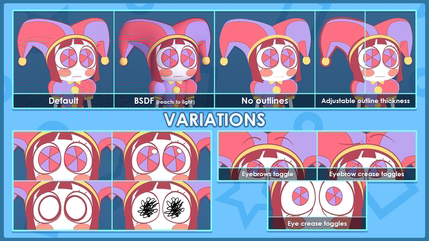 - FK/IK toggles for limbs and hat's pompons with stretchy properties.