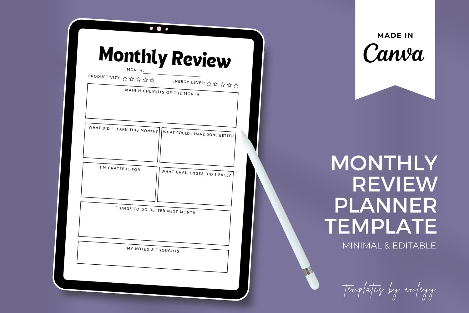 Monthly Review Planner Template – Editable Canva Reflection Journal