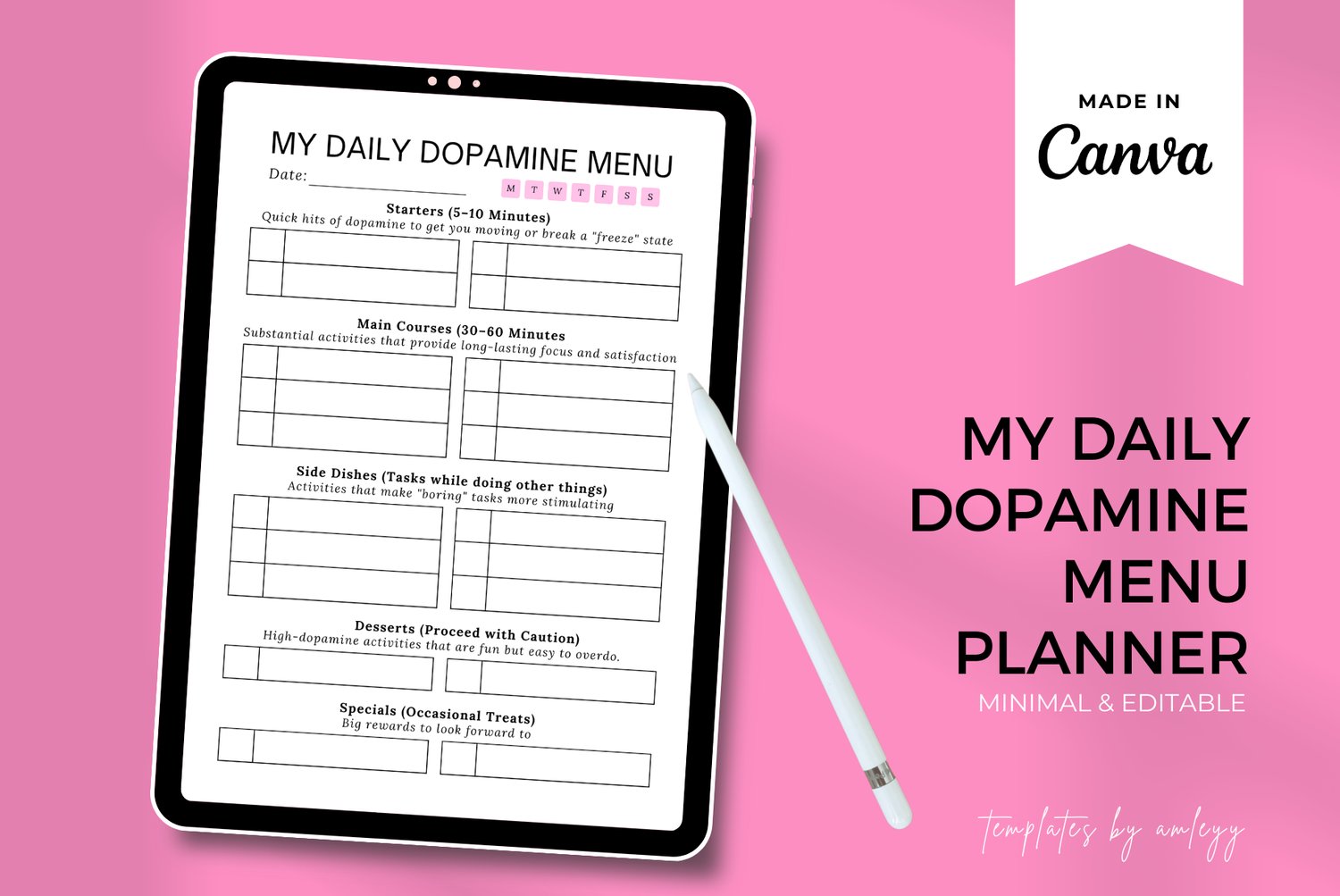 ADHD Dopamine Menu Planner Template | Neurodivergent-Friendly Self Care Canva Template | Digital Wellness Tracker Page