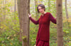 Construction begins with a provisional cast on at the high empire waist and the bodice is worked in one piece up towards the shoulders, dividing for the armholes. The shoulders are shaped with short rows and finished off with a three-needle bind-off. Stitches are then reclaimed from the provisional cast on and the lower portion of the sweater is worked from the waist down to the hem. Subtle A-line shaping is achieved by using progressively larger needles thus eliminating the need to work increases into the stitch pattern and providing extra drape towards the hem. Inset sleeves are worked from cuff to cap and set into the armholes.