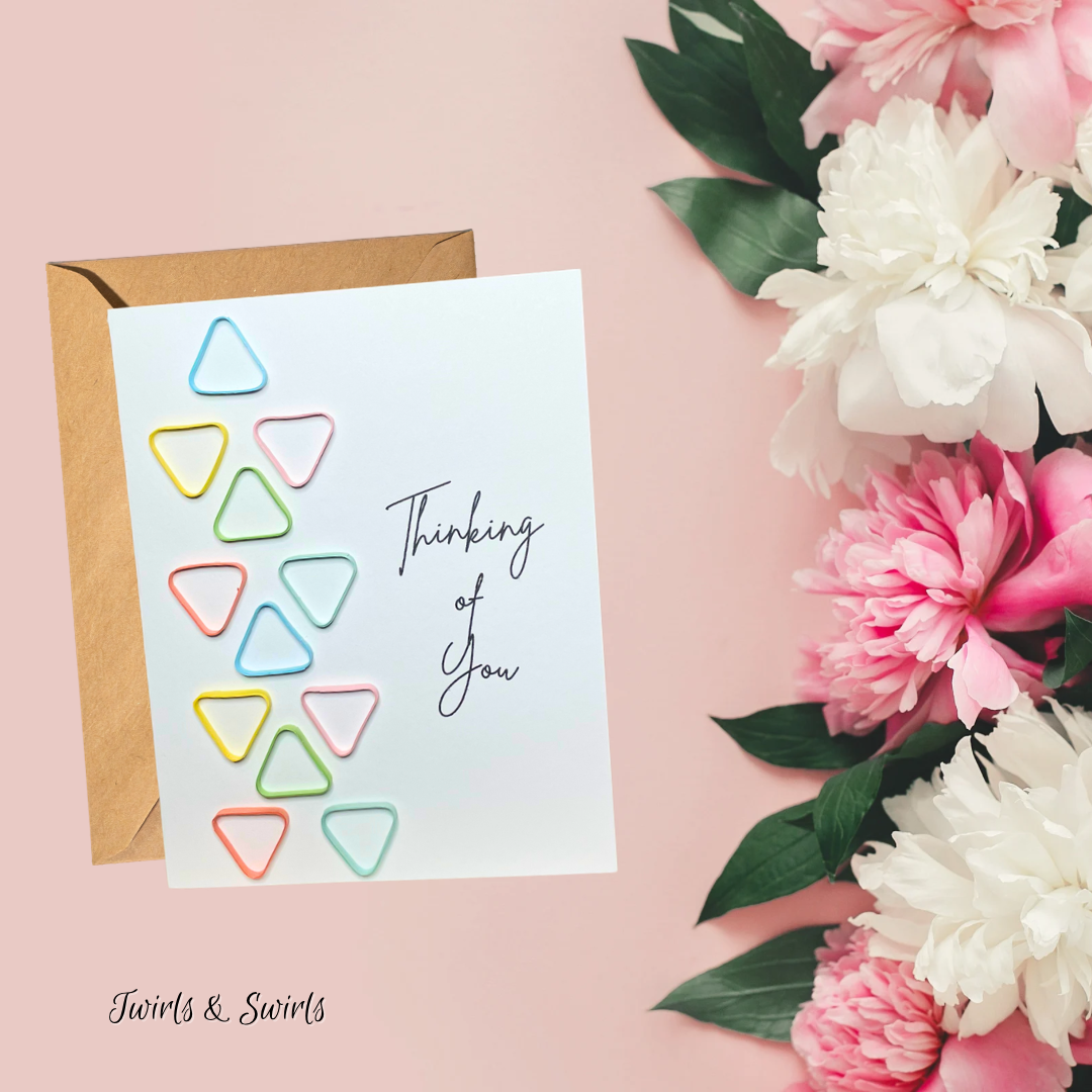 Send comfort and care with this handcrafted “Thinking of You” card, designed to gently remind someone they’re not alone. Featuring a vertical pattern of delicate quilled triangle outlines along the side, this design brings a modern, minimal touch while still feeling warm and meaningful.