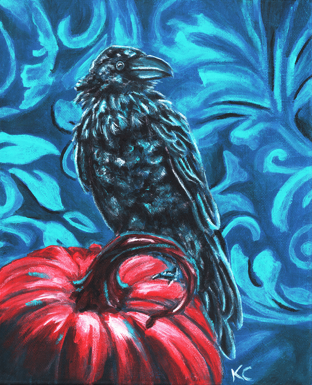Midnight Masquerade invites viewers into a world where mystery and symbolism intertwine. A raven, perched upon a pumpkin, embodies both intelligence and enigma, while the teal filigree background adds an ornate touch of elegance and intrigue. Painted in acrylic, the piece balances shadow and vibrancy echoing themes of transformation, hidden stories, and the quiet drama of night. This work celebrates the beauty of contrasts --light and dark, simple and elaborate, natural and symbolic--much like the masks we wear and the secrets we keep.