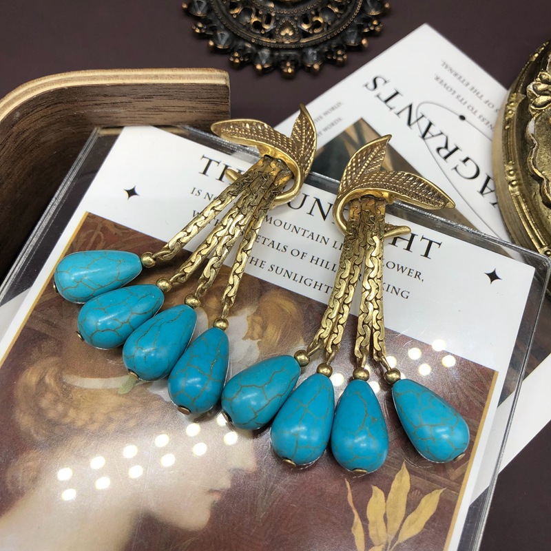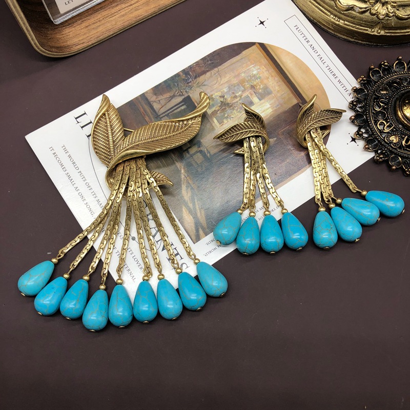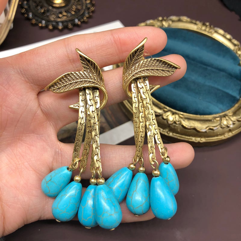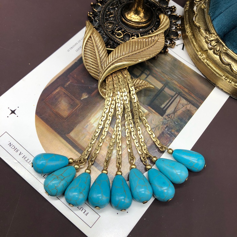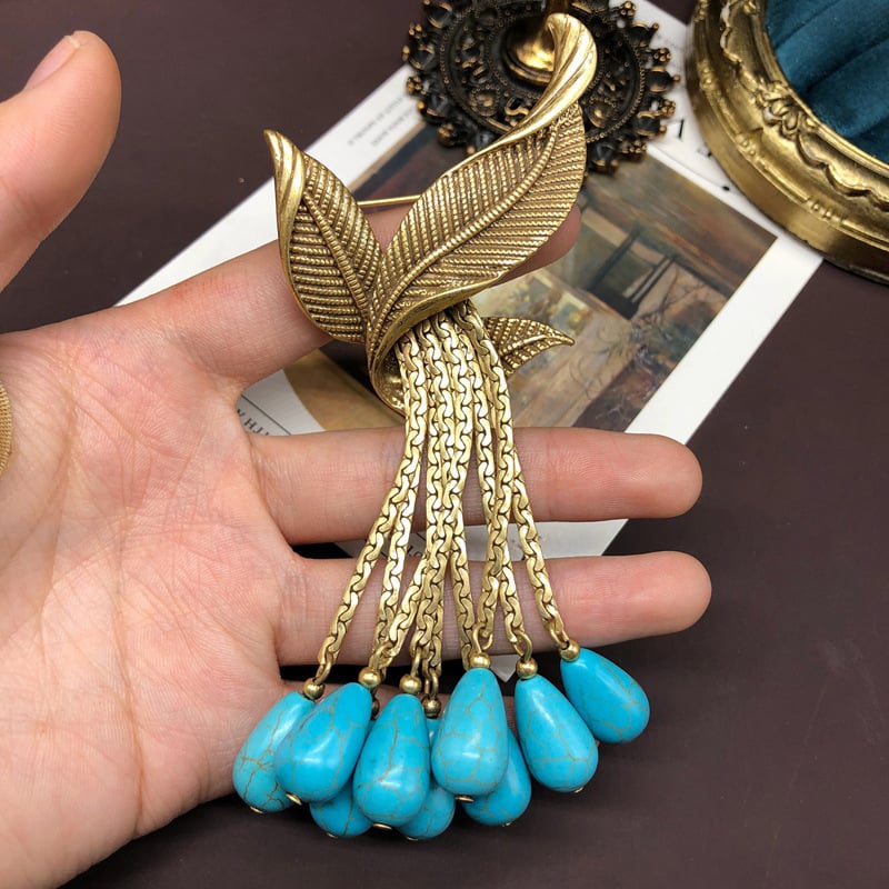 Vintage turquoise gold copper tassel leaf brooch earrings set