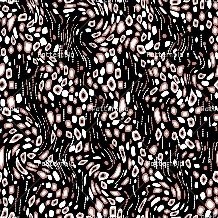 Distorted mosaic pebbles in rose and white on black.