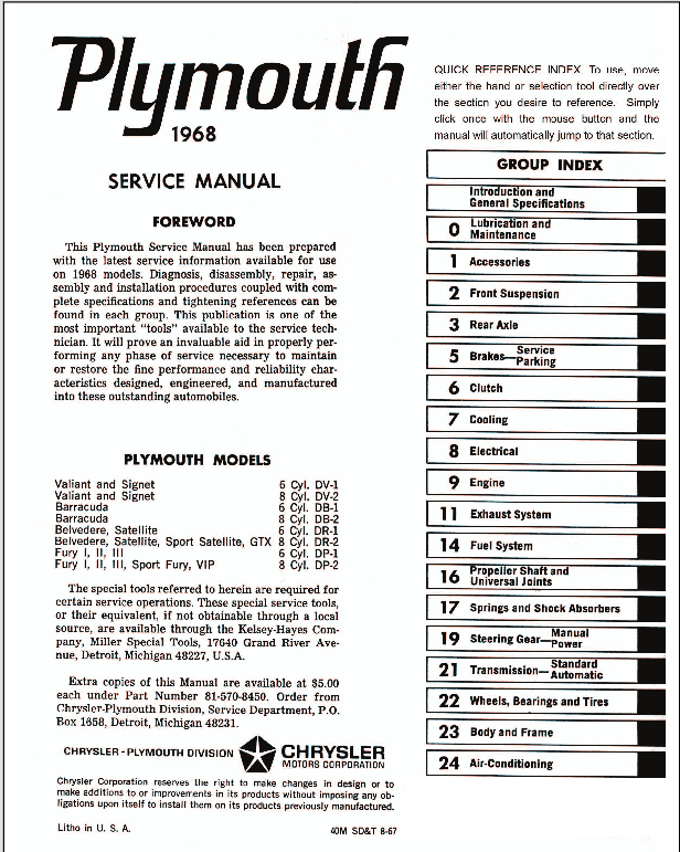 1968 Plymouth Valiant Signet Barracuda Belvedere Satellite Fury Service Manual