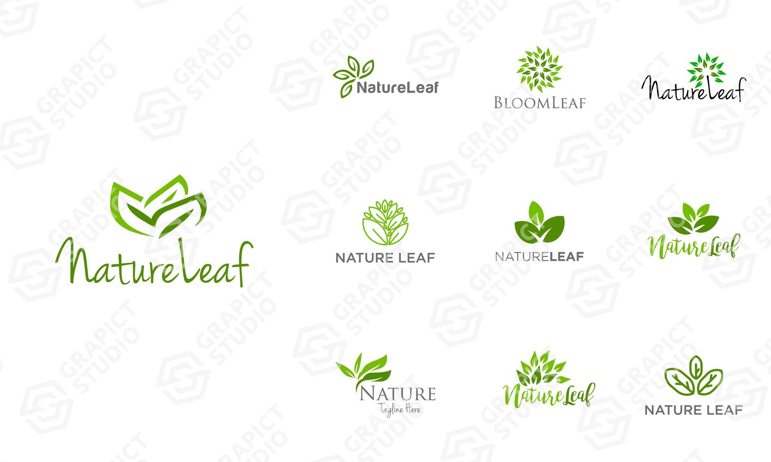 Nature leaf Logo Design Element, set of 10. Creative geometric leaf logo icon for vegetarian, botanical, farm, salad, herbal medical. Creative illustration of abstract leaf related to blogger, vlogger, podcast, business, company or personal profile.