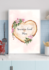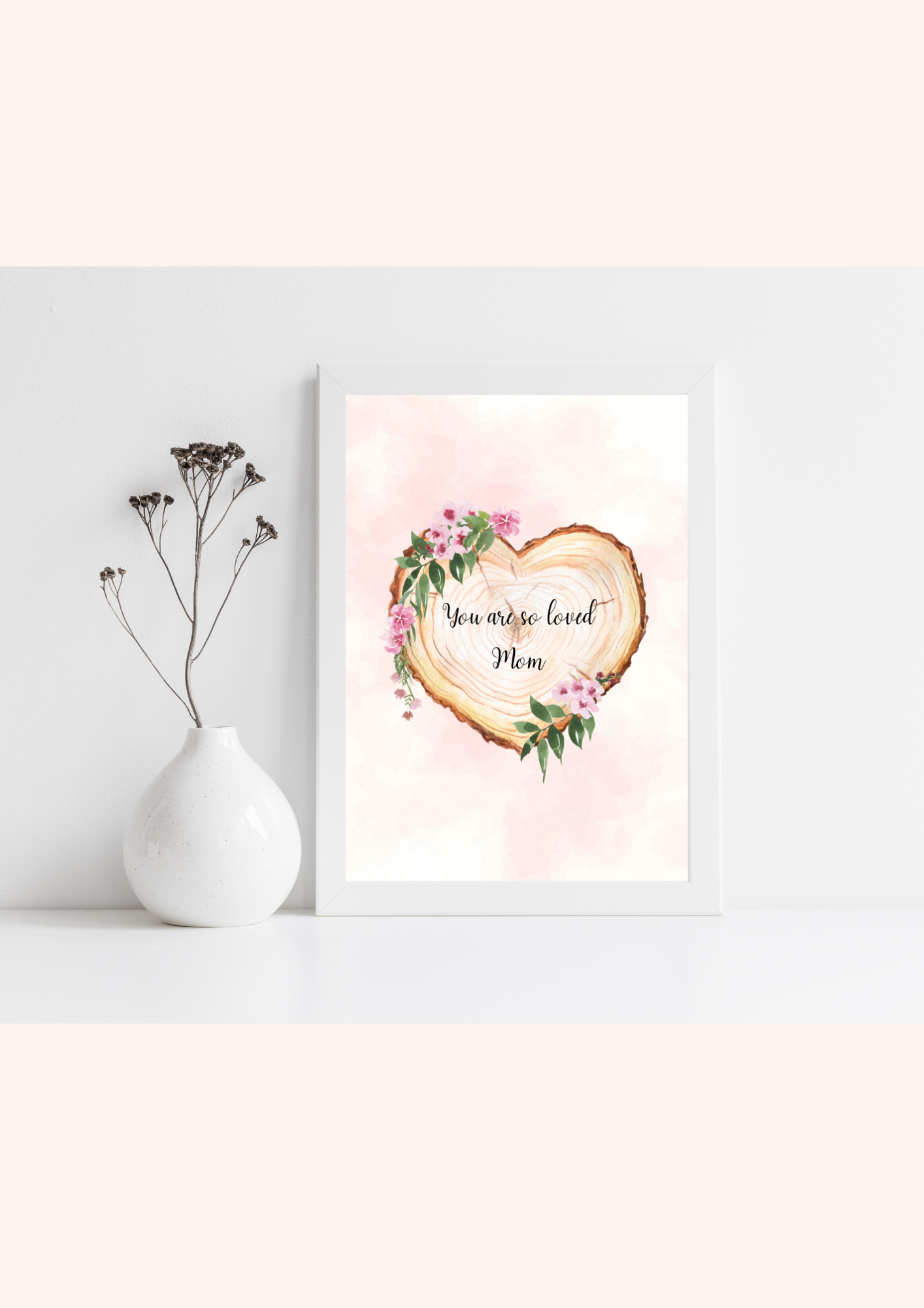 Beautiful Heart Shaped Watercolor Wood Slice on a Pink Background Decorated with Pretty Pink Flowers and text “You Are So Loved Mom”-A Lovely Mothers Day Gift or Birthday Gift for Mom or Mother in Law- Wall Art for Mom-Mothers Day Qoute Art
