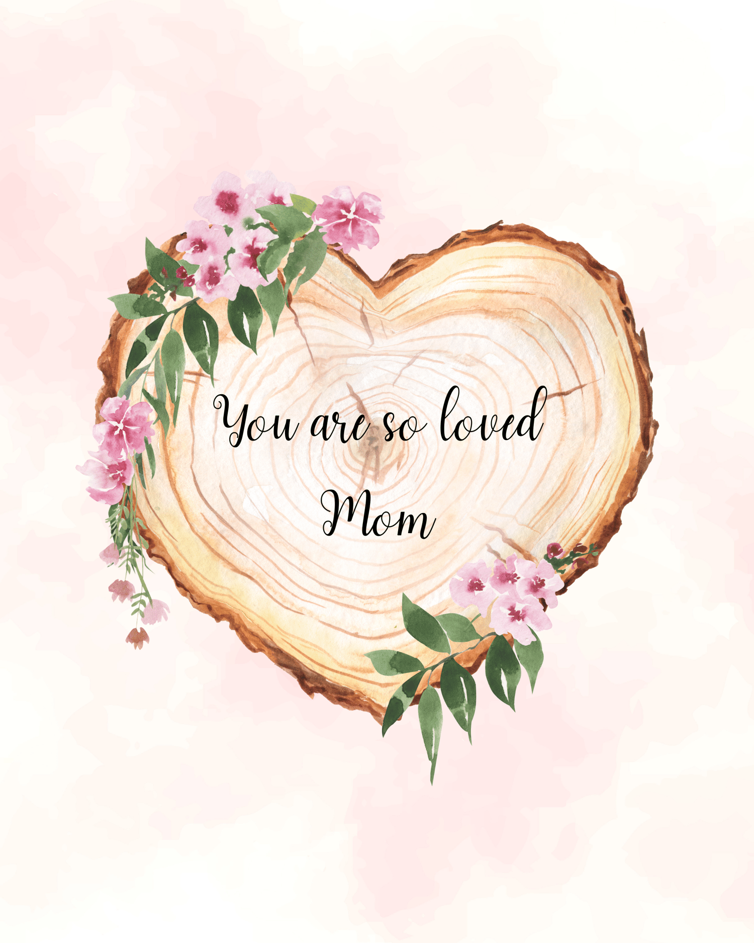 Beautiful watercolor heart-shaped wood slice decorated with pink flowers and the inscription "You are so loved mom". A lovely gift for Mother's Day, a birthday gift for mom, or a surprise gift for your mom or mother-in-law.