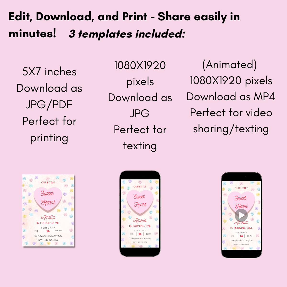 Edit Online, download and share today! Get instant access to this self-editing Sweetheart Candy Birthday Invitation Template! Purchase, edit, and print within minutes! This instant download invitation is editable directly in your browser or on mobile device using Canva.com. No need to download any software, fonts, or wait for proofs.