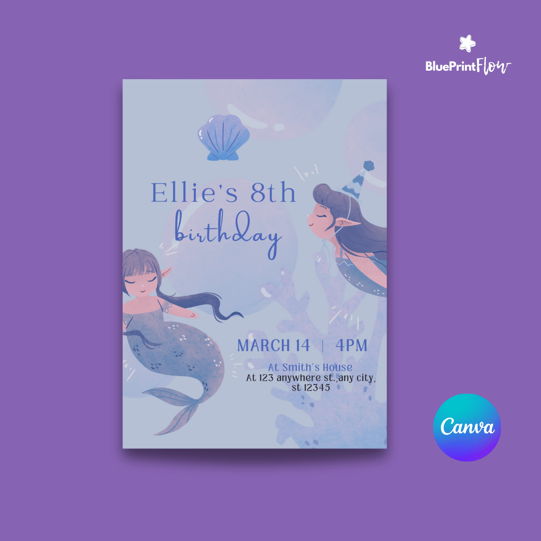 Cute Blue Mermaid's Party Birthday Invitation Card Canva Template Design