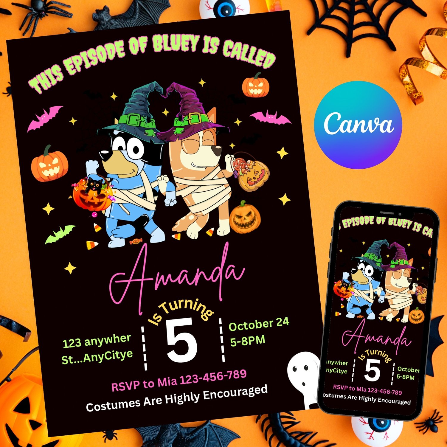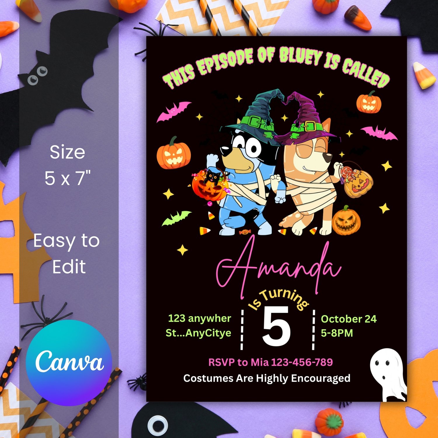 1 Editable Halloween Bluey Invitation (size 5x7 inches)