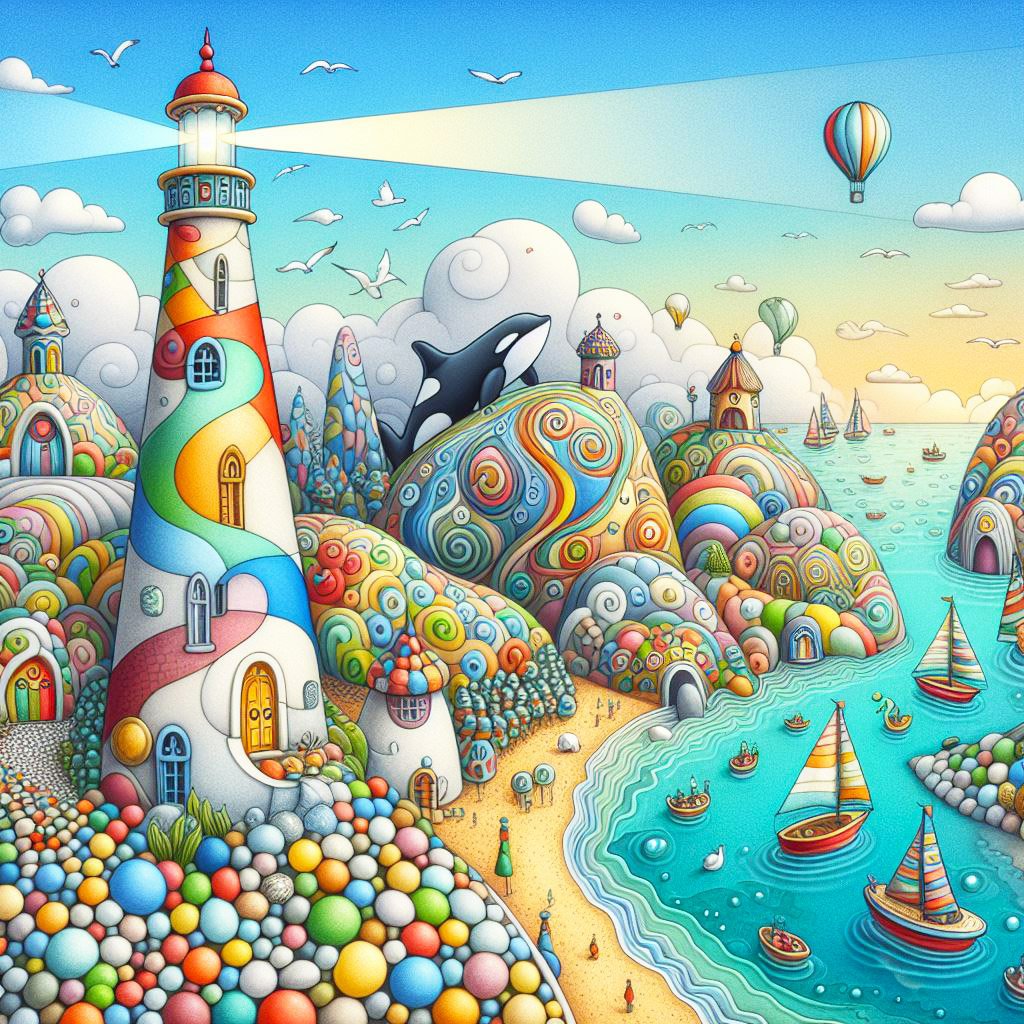 Colourful patterned lighthouse shining a light beam. Boats ride in a turquoise sea. There are whimsical houses made of swirly patterned marble on high hills & coloured pebble pathways. There is a beach & a killer whale leaping from the water & seagulls fly in the sky. There is a hot air balloon.