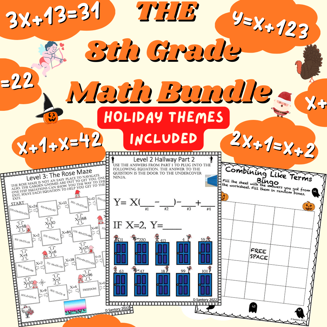 8th Grade Variable Equations Bundle (Holidays Included) | Math Activities, Games and Guided Notes