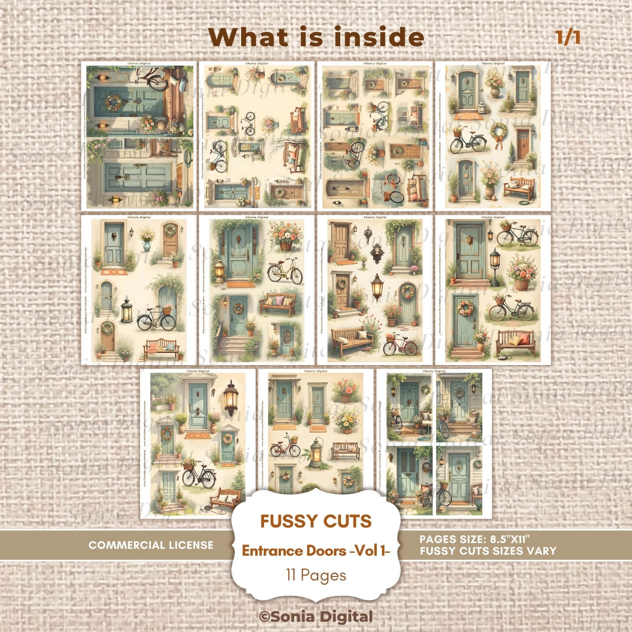🔸11 printable Fussy Cuts pages, “Entrance Doors” Collection (Vol 1). In Letter size, 8.5”x11”. All pages are sold watermark-free. Fussy Cuts Sizes vary. Commercial use license included*.