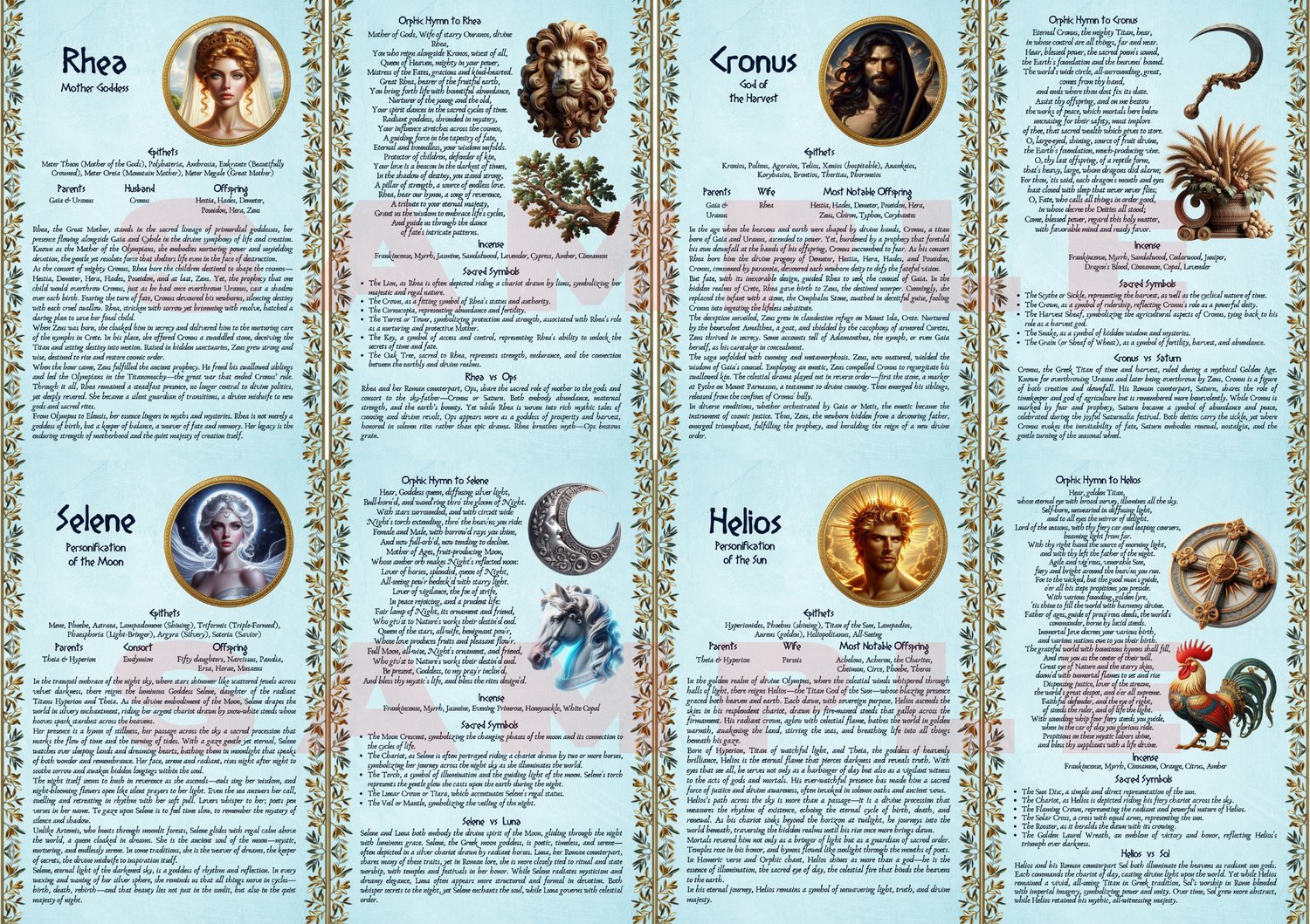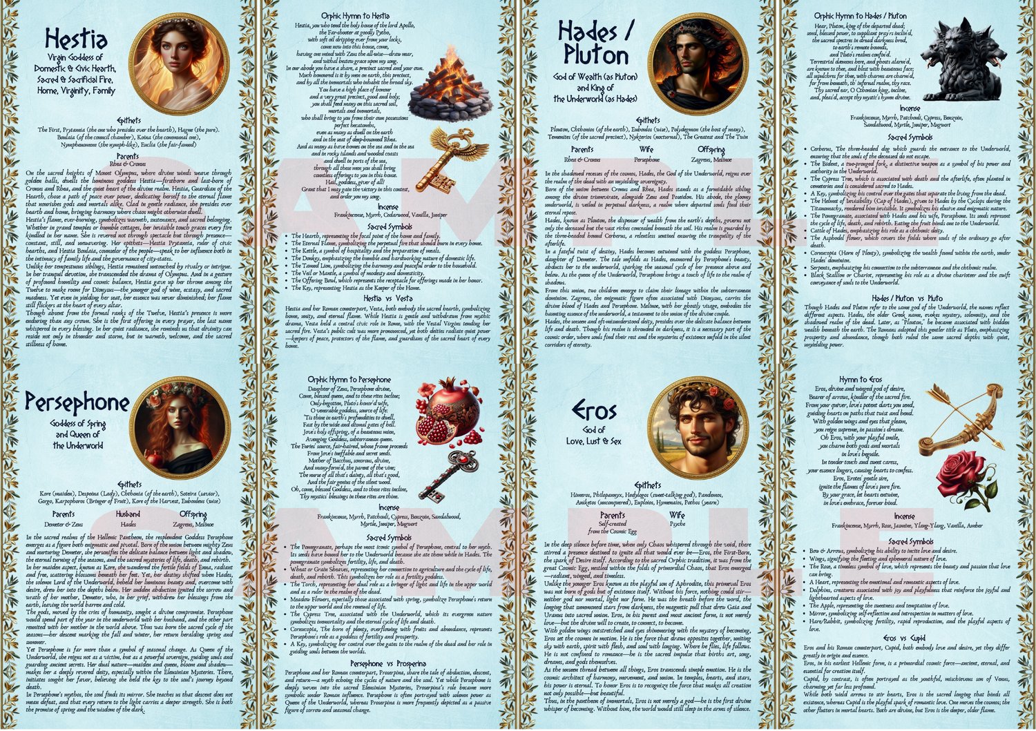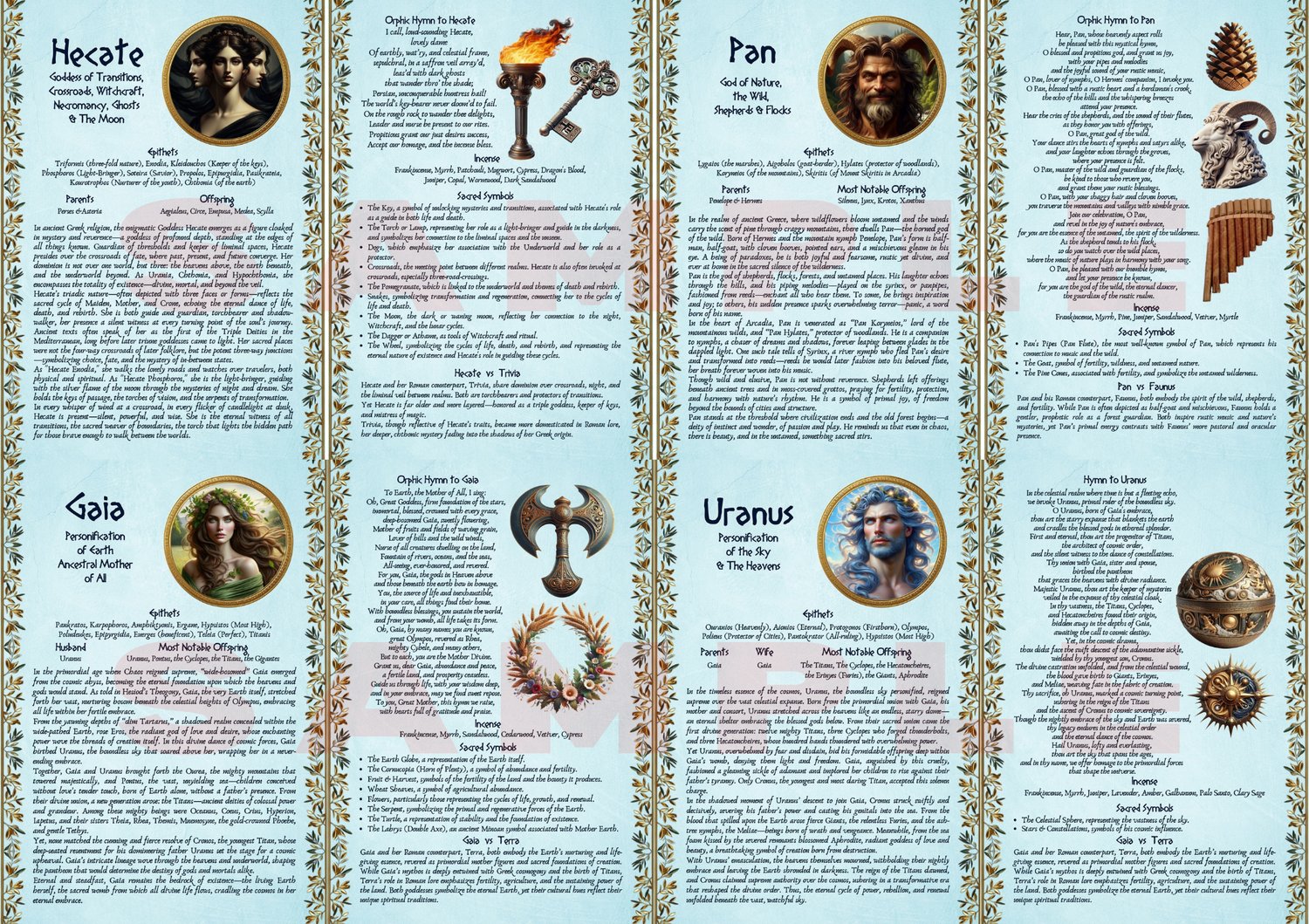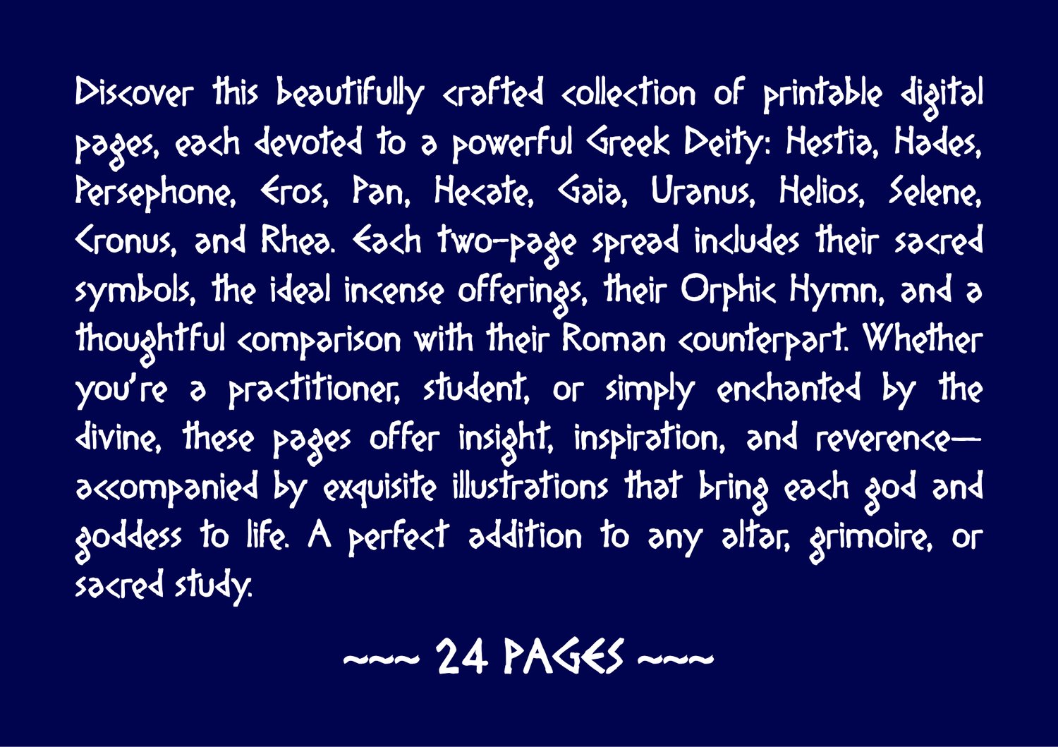 Discover this beautifully crafted collection of printable digital pages, each devoted to a powerful Greek Deity: Hestia, Hades, Persephone, Eros, Pan, Hecate, Gaia, Uranus, Helios, Selene, Cronus, and Rhea. Each two-page spread includes their sacred symbols, the ideal incense offerings, their Orphic Hymn, and a thoughtful comparison with their Roman counterpart. Whether you're a practitioner, student, or simply enchanted by the divine, these pages offer insight, inspiration, and reverence—accompanied by exquisite illustrations that bring each god and goddess to life. A perfect addition to any altar, grimoire, or sacred study.